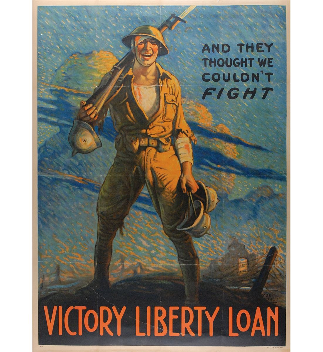 Vivid original color 30.5 x 41 World War I poster from 1919, featuring artwork by Clyde Forsythe that shows a triumphant American soldier holding three German helmets as trophies of war. Black text in the upper right reads, “And they thought we couldn't fight,” with prominent red text across the bottom reading, “Victory Liberty Loan.” Printed in the bottom border is “5-C” and “Ketterlinus, Phila.” Poster has been professionally linen-backed to a slightly larger size. In very good condition, with several smoothed intersecting folds and a large diagonal crease to the lower left.