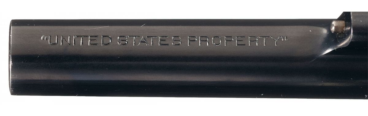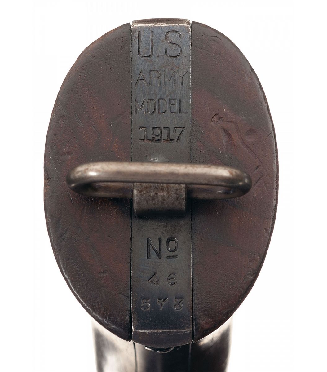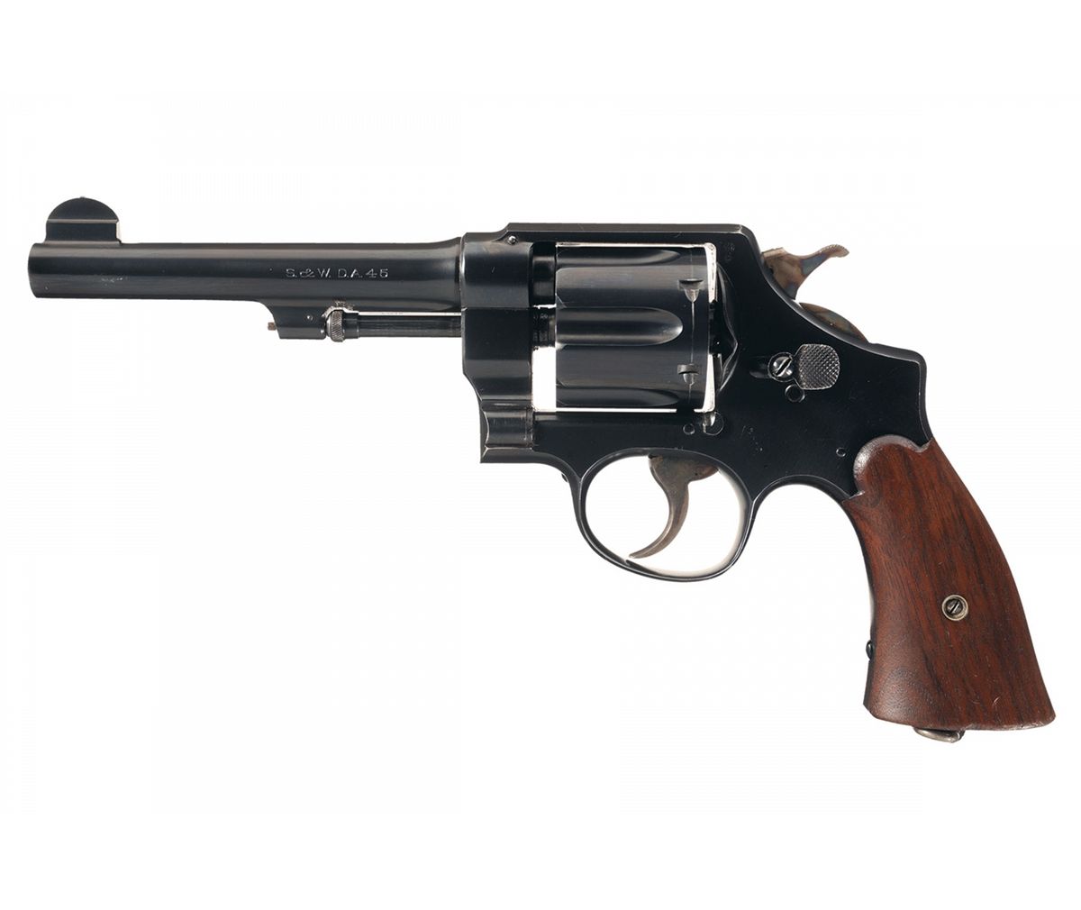 This is an excellent example of a Smith & Wesson Model 1917 U.S. Army Revolver. It features fixed sights with round blade front and a notch frame cut rear sight. The top of the barrel has the two line S&W address/patent dates. The left side of the barrel is marked "S&W DA 45", the underside of the barrel is marked "UNITED STATES PROPERTY" and the butt is marked "U.S./ARMY/MODEL/1917/No/46/573". Flaming ordnance bomb on upper right side of left frame. The matching serial number is marked on the butt, barrel and rear cylinder face. The crane and frame are marked with the assembly number "8664". Fitted with smooth walnut grips.