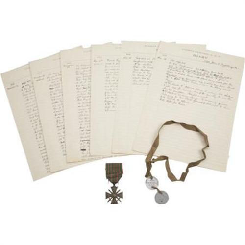 <B>World War I and Paris Peace Conference Archive</B></I>. A good archive of more than 200 pieces, many placed in a scrap-book, including letters, documents, and ephemera related to the service of Captain John T. Nightingale of the 71st. Coastal Artillery Reserve Corps; that unit that was sent to France in the summer of 1918. Following the November, 1918 armistice, Captain Nightingale, a fluent French speaker, requested to stay in France upon the return of his regiment. His requests, granted, have him join the "<I>renting, requisitioning and claim service</B></I>" at Tours looking after lost luggage. He then he received a new order on December 4, directing him "<I>to proceed at once to Paris reporting to the CG district of Paris for Temporary Duty in connection with the Peace conference...</B></I>" According to a recommendation by his superior in March 1919, Nightingale was "<I>in charge of the baggage and train departments of the Military Section of the Peace Commission...He has also been in charge of compiling a report of the expenses to the Army of the Peace commission...</B></I>" During his tenure, he traveled with the Presidential Party to London, Brussels, as well as Rome dealing with all manner of logistics. Much of the ephemera and letters (most are retained carbon copies) concern his escort of the President including detailed itineraries for official trips, notes and orders concerning protocols for various functions including official reviews, passes to conferences as well as the House of Commons, rail tickets, small portions of an official diary kept by Nightingale, as well an official invitation to visit with Edith Wilson among other material. The archive also includes some detailed memorandums on the official trips, copies of which are in this collection providing a vivid picture of his experiences. Of particular note is a lengthy memorandum on Wilson's official visit to Belgium from June 17 to 20, 1919, written by one of Nightingale's colleagues. Wile touring the trenches at Ypres, the writer remarked that he "<I>happened to be walking with the Comtesse d'Ultremont, the Lady in Waiting - 'It is terrible,' she said, 'I can hardly bear to see these things. It was so beautiful, so lovely and peaceful, when I knew it five years ago.' She is rather a lovely looking, and very simple women; but when she spoke of this, there was a harness </B></I> that <I>came into her eyes which was noticeably unpleasant to see...I realized those stark walls, those endless stretches of destruction, who see them only as a terrible desert, and what those people saw, who had known them in their beauty, been brought up with them as traditions of their country, enjoyed happy days in them...</B></I>" Though Nightingale was responsible for the baggage, his artillery experience came in handy at times. The archive includes his account of a preliminary trip to the French battlefields with the Secret Service in order to assess the suitability for President Wilson to make an official visit. Nightingale concluded after much researching that an automobile journey would be nearly impossible due to destroyed roads and the lack of accommodations recommending instead a journey by train and adding a stern warning: "<I>Everywhere we went we found unexploded hand and rifle grenades, duds and everywhere over the battle fields are quantities of abandoned artillery ammunition. Every member of the President's party should be cautioned before hand to lave things of this sort alone. Before he was warned of the danger Mr. Jervis, Mr. Moran's assistant had attempted to break open a German rifle grenade...This is some thing that any inexperienced civilian might attempt with very serious consequences to him and those about him...</B></I>" The collection also includes a wide variety of ephemera including tickets, calling cards, newspapers printed aboard ship, as well as Nightingale's dog tags and his French World War I service medal together with a tiny mounted photo of the young officer in field uniform. A wonderful collection certainly worthy of further research. The collection also contains some excellent ephemera including postcards, passes and the like and should most certainly be viewed. Condition is overall good to very good with the expected wear including folds and the occasional marginal tear.<BR><BR><b>Shipping:</b> Books & Catalogs (<a target="_blank" href="http://www.heritageauctions.com/common/shipping.php">view shipping information</a>)