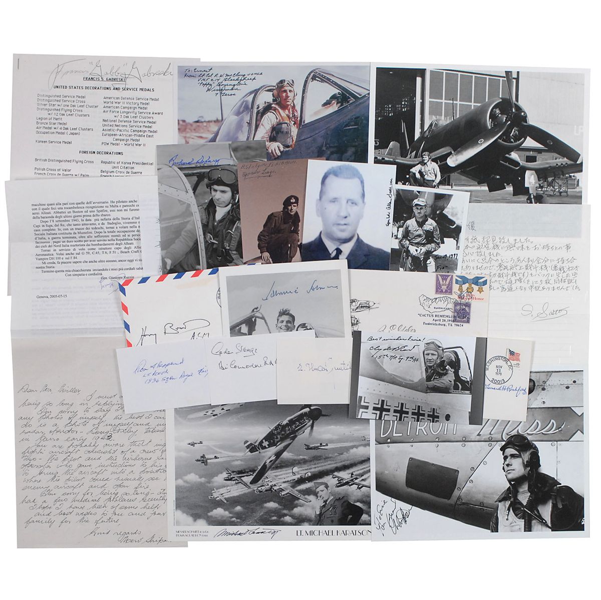 Collection of 22 items consisting primarily of signed photos and signatures, with a few letters, articles, and a cover also included, each signed in ink or felt tip by a World War II ace. Signers are: Luigi Gorrini, Allan Scott, Donald J. Sheppard, R. E. Galer, Michael Karatsonyi, Urban L. Drew, R. W. McClurg, Leonard Rochford (World War I ace), Leonard R. Reeves, Saburo Saito, Ken Walsh, Richard Asbury, E. Ilmari Juutilainen, Clyde East, Gordon Steege, Satoshi Anabuki, Joe Robbins, Gabby Gabreski, Giuseppe Ruzzin, Mervyn Shipard, Johnnie Johnson, and Harry Broadhurst. In fine condition.