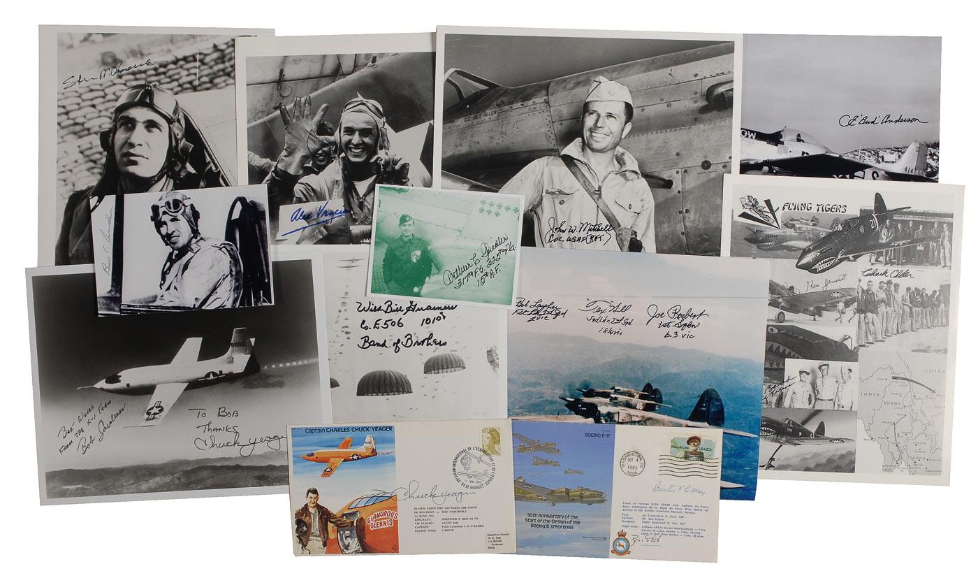 Twelve items: ten photos, mostly 8 x 10 or 10 x 8, various finishes, each signed in felt tip or ballpoint. Signers include: C. E. ‘Bud’ Anderson (2), Arthur Fiedler, ‘Wild’ Bill Guarnere, ‘Tex’ Hill, Bob Layher, John W. Mitchell, Chuck Older, Steve Pisanos, Joe Rosbert, Alex Vracis, and Chuck Yeager (ins); and two commemorative flight flown postal covers individually signed in ink by Curtis LeMay and Chuck Yeager. In overall fine condition.