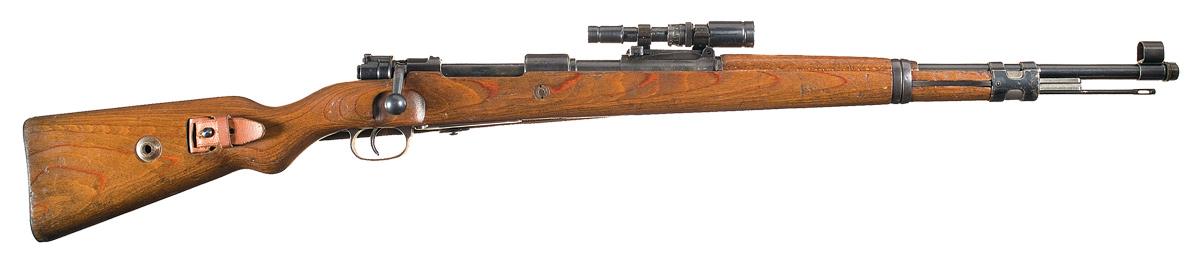 Hooded blade front and tangent rear sights, with "eagle/214" proofs on the barrel and receiver ring, and "duv/ 41" on the ring. With a rare original primary contractor marked "cxn" code Z.F.-41 scope, numbered 125101 with sunshields and a rare flat roller experimental base and "duv" mount. Milled components, with matching numbers. Smooth stock, with Luftwaffe stamp, matching number, "214" proofs, flat buttplate and a brown leather sling.