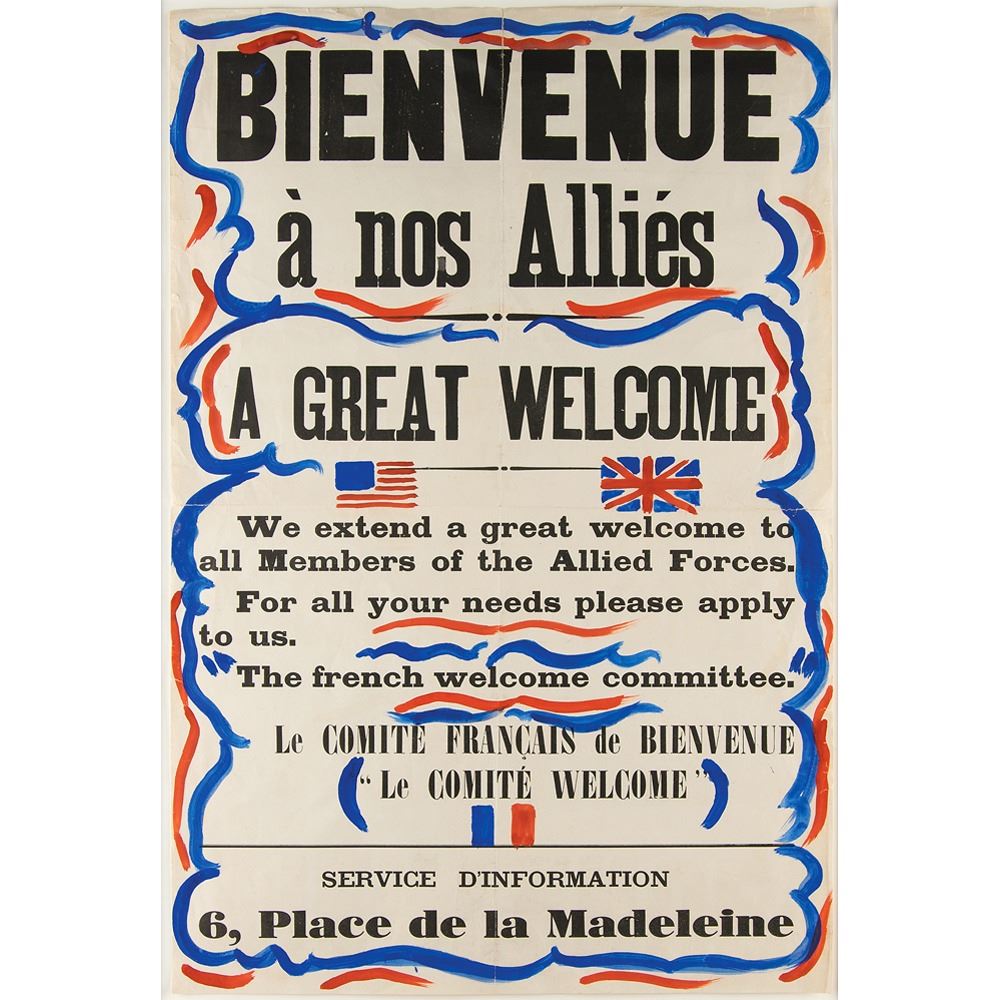 Museum quality, hand-colored and embellished World War II broadside from post-liberation Paris, (circa 1944-45), 15.75 x 23.5, archivally mounted, matted, and framed under museum glass to an overall size of 23 x 30.5. Text in English and French – “Bienvenue á nos Alliés. A GREAT WELCOME. We extend a great welcome to all Members of the Allied Forces. For all of your needs please apply to us. The french welcome committee.†Hand-colored flags of the United States, Great Britain and France vividly painted on the broadside, welcoming American, British, and other allied troops to the newly liberated city. Red and blue hand-painted decorative borders of the broadside. The broadside promotes the information office of the French Welcome Committee – “Le Comité Français de Bienvenue†located in Paris, 6, Place de la Madeleine. Accompanied by a pamphlet, "The Charm of Paris," published by the "French Welcome Committee" (Spring 1945).