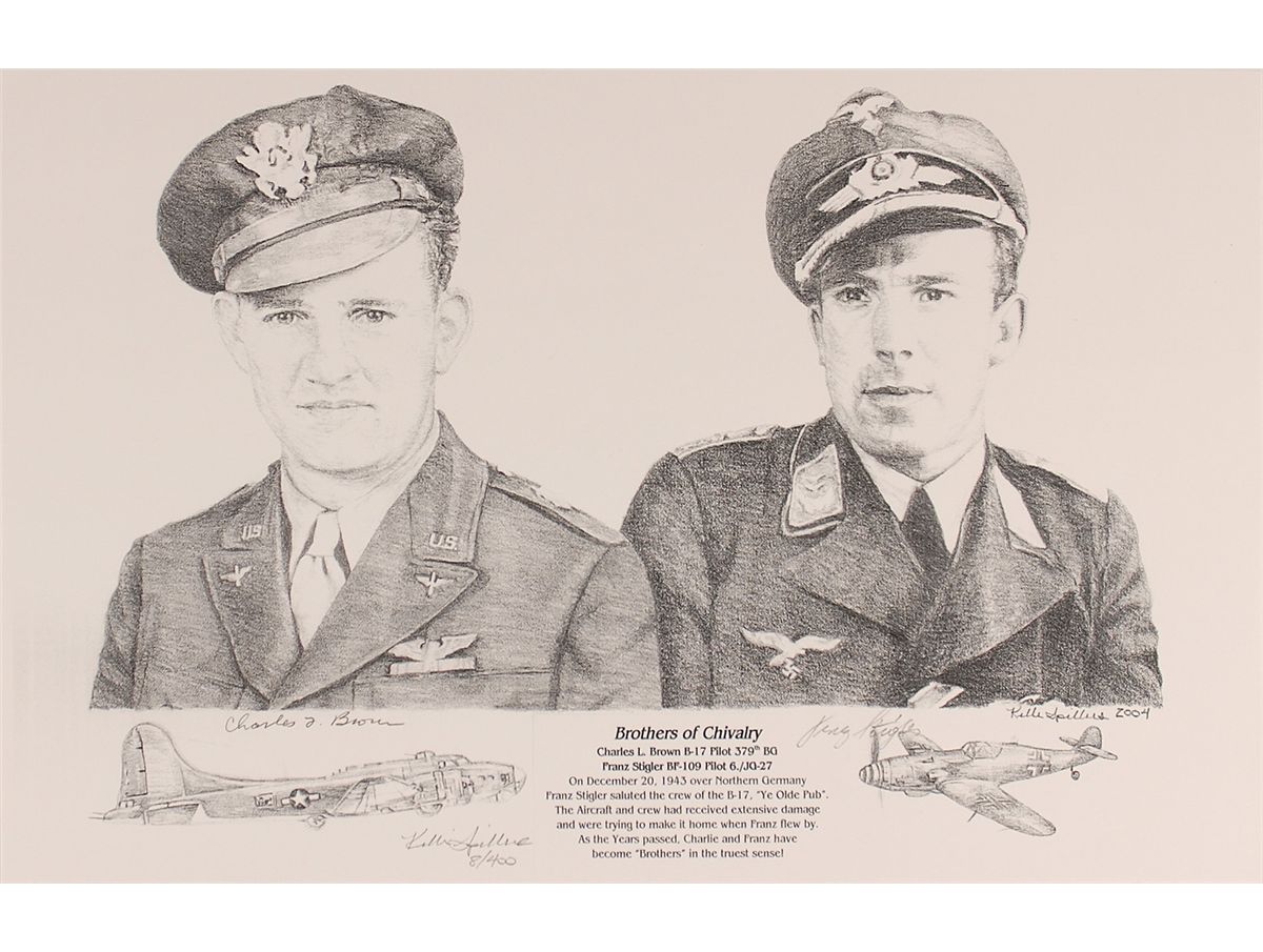 Limited edition 17 x 11 print entitled Brothers of Chivalry, numbered #8/400, signed in pencil, “Charles L. Brown” and “Franz Stigler.” Also signed in pencil by the artist, Kelli Spiller. In fine condition.