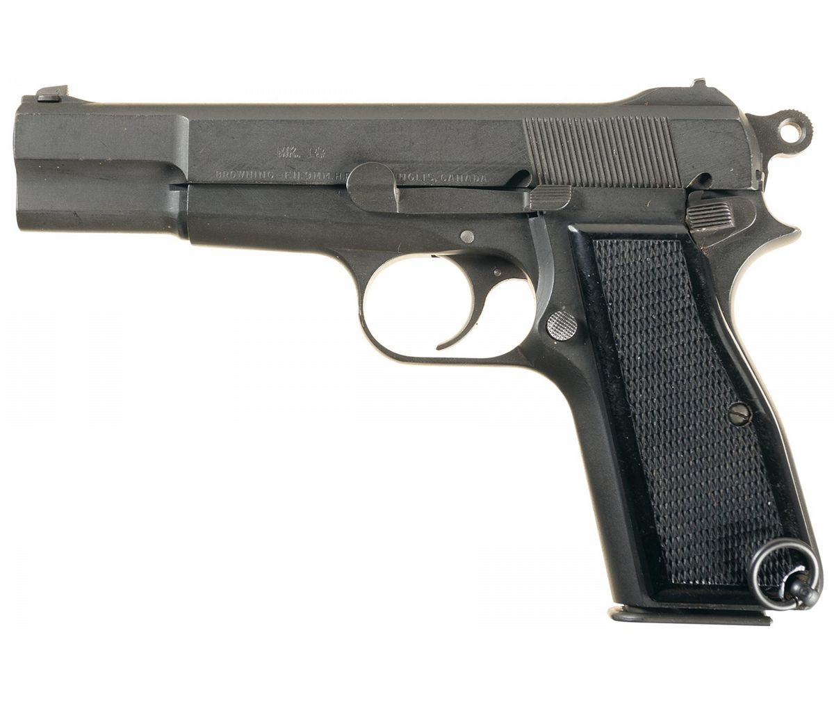 This is a late production version manufactured by the Inglis factory in Canada. It has the fixed front and rear sight with no stock slot in the back strap. The slide has the two line, markings of: "Mk I*/BROWNING -FN 9MM HP-INGLIS CANADA". The right side of the pistol has the stacked serial number "6T390" on the frame slide and barrel, along with a partial Canadian Broad Arrow C proof and the Crossed Sceptre proofs on the frame and slide. It is fitted with checkered black plastic grips and is complete with one WWII "JI" marked magazine.