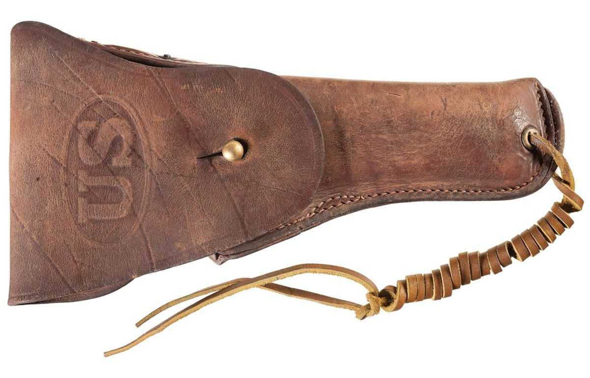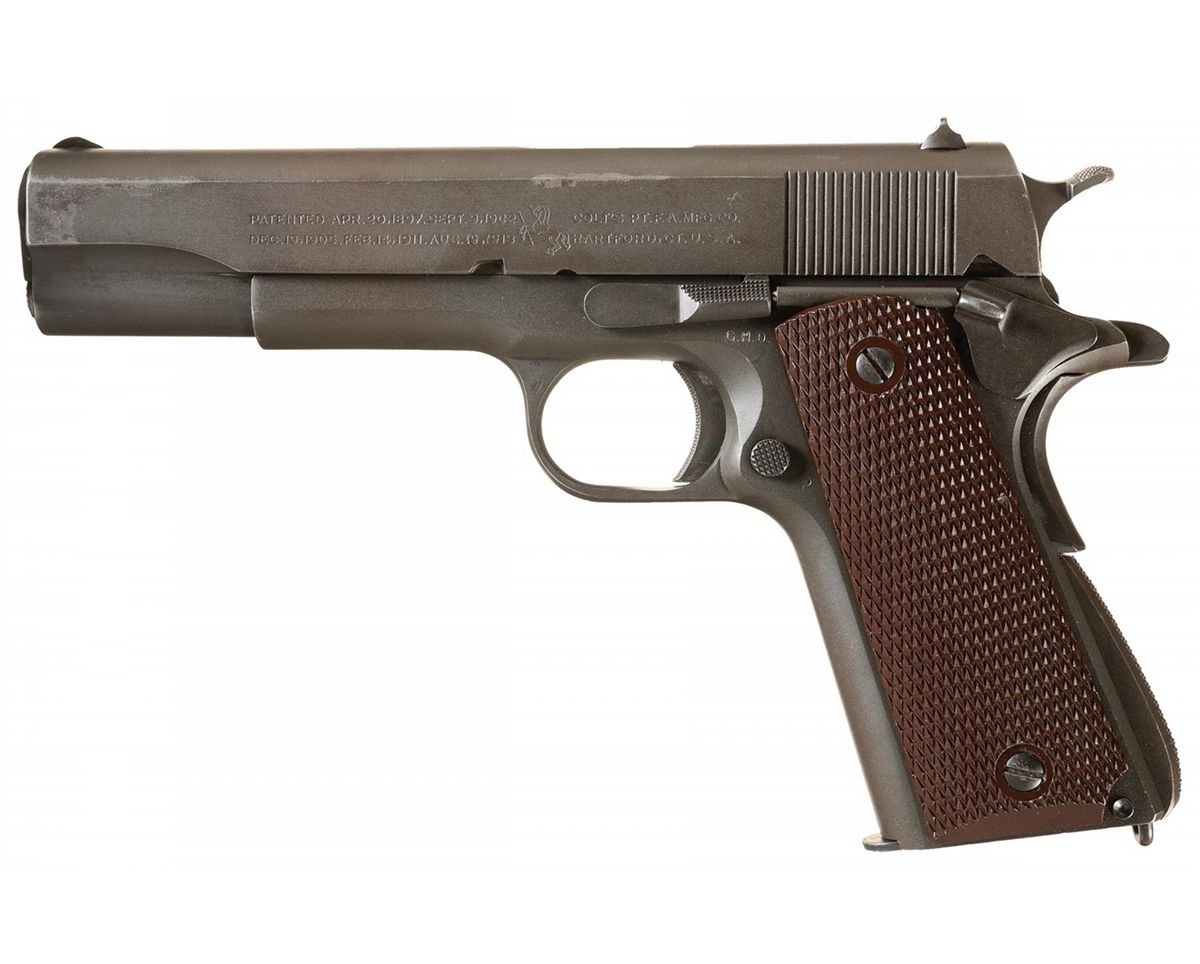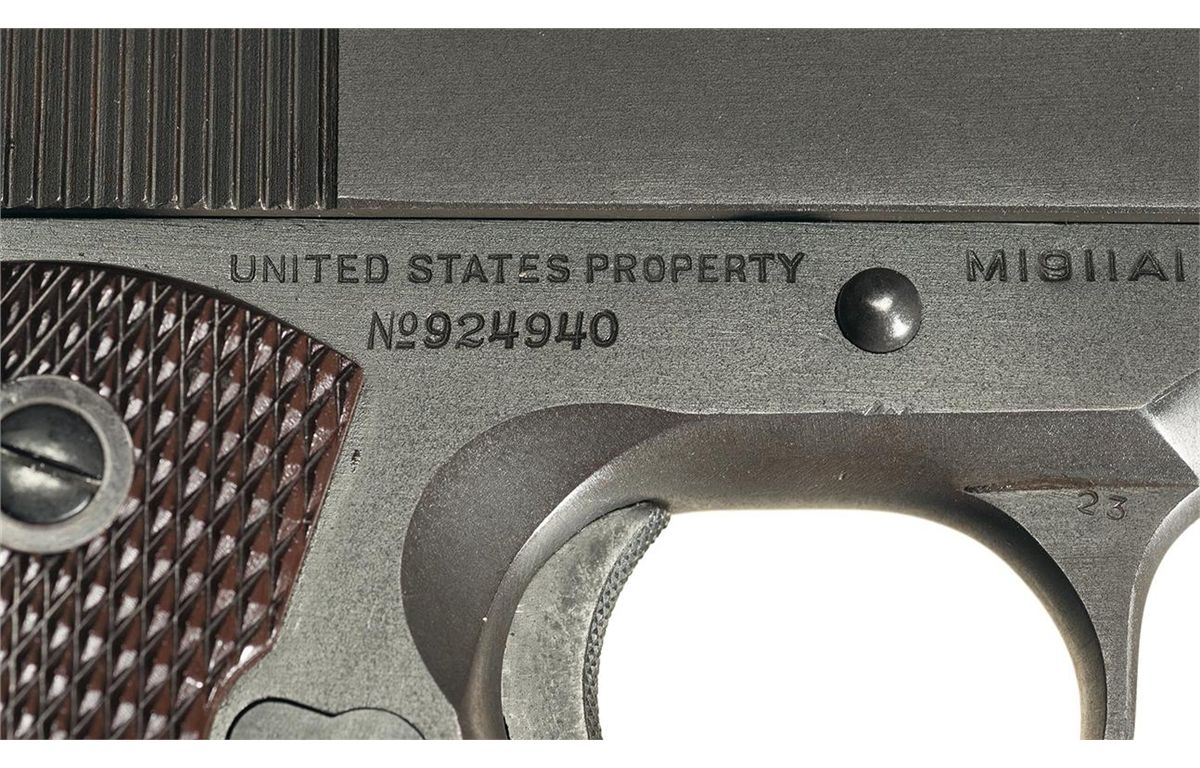 Manufactured in early 1943. The left side of the slide is marked with the two line, two block address and 1897-1913 patent marking with the Rampant Colt in the center, "P" on top of the slide in front of the rear sight, and the left side of the frame is marked with a "G.H.D." inspector cartouche above the magazine catch and "P" below it. The "No" style serial number on the right side of the frame as well as "UNITED STATES PROPERTY" and "M1911A1 U.S.ARMY" markings. Matching numbered slide. Standard low profile sights, checkered slide stop, magazine release, thumb safety, wide spur hammer and arched main spring housing. Blue barrel and magazine marked "C-S" on the bottom of the toe and "S" on top. Fitted with brown plastic checkered grips with re-enforcement rings around the screws. Complete with a "SEARS/1942" and "US" marked flap holster with lanyard.