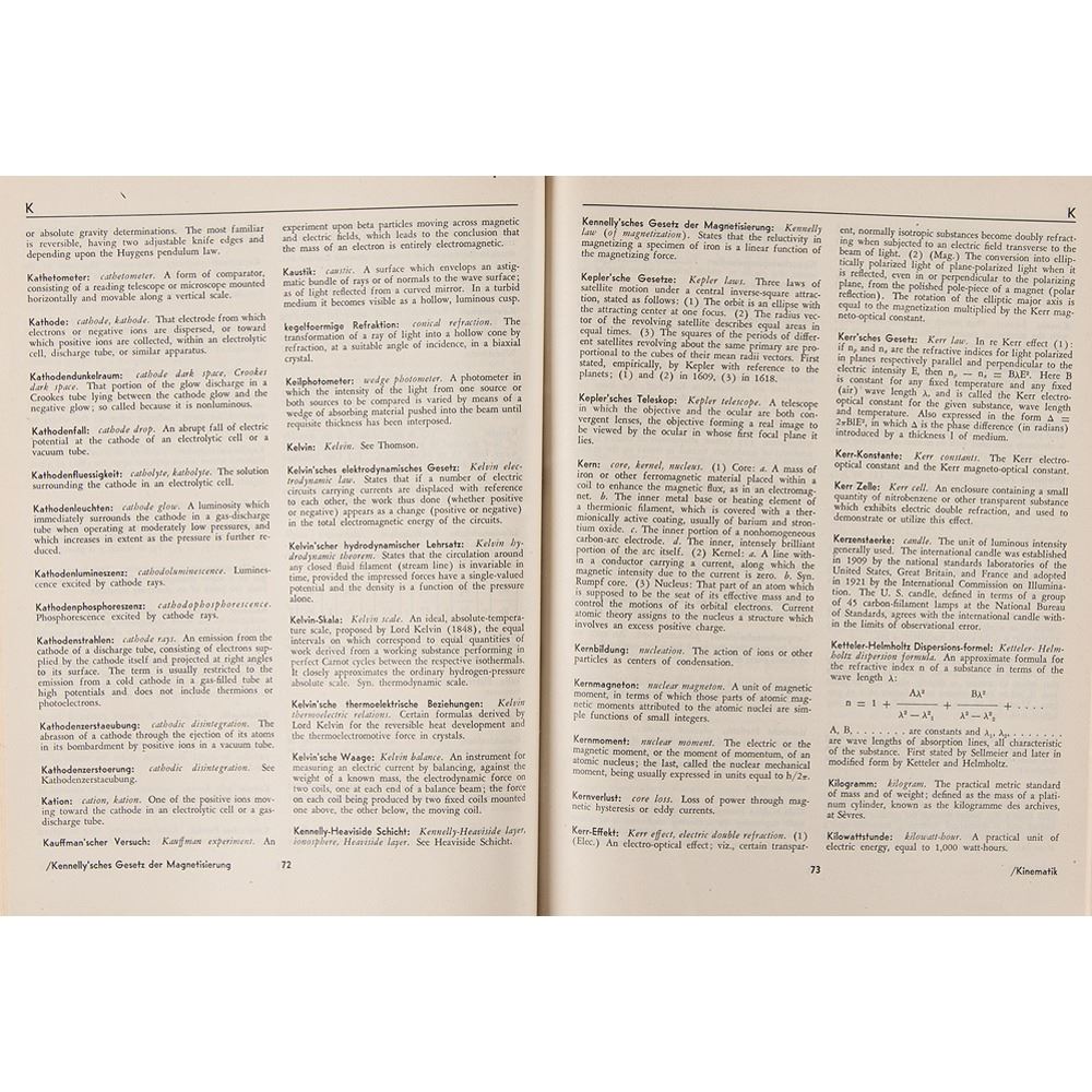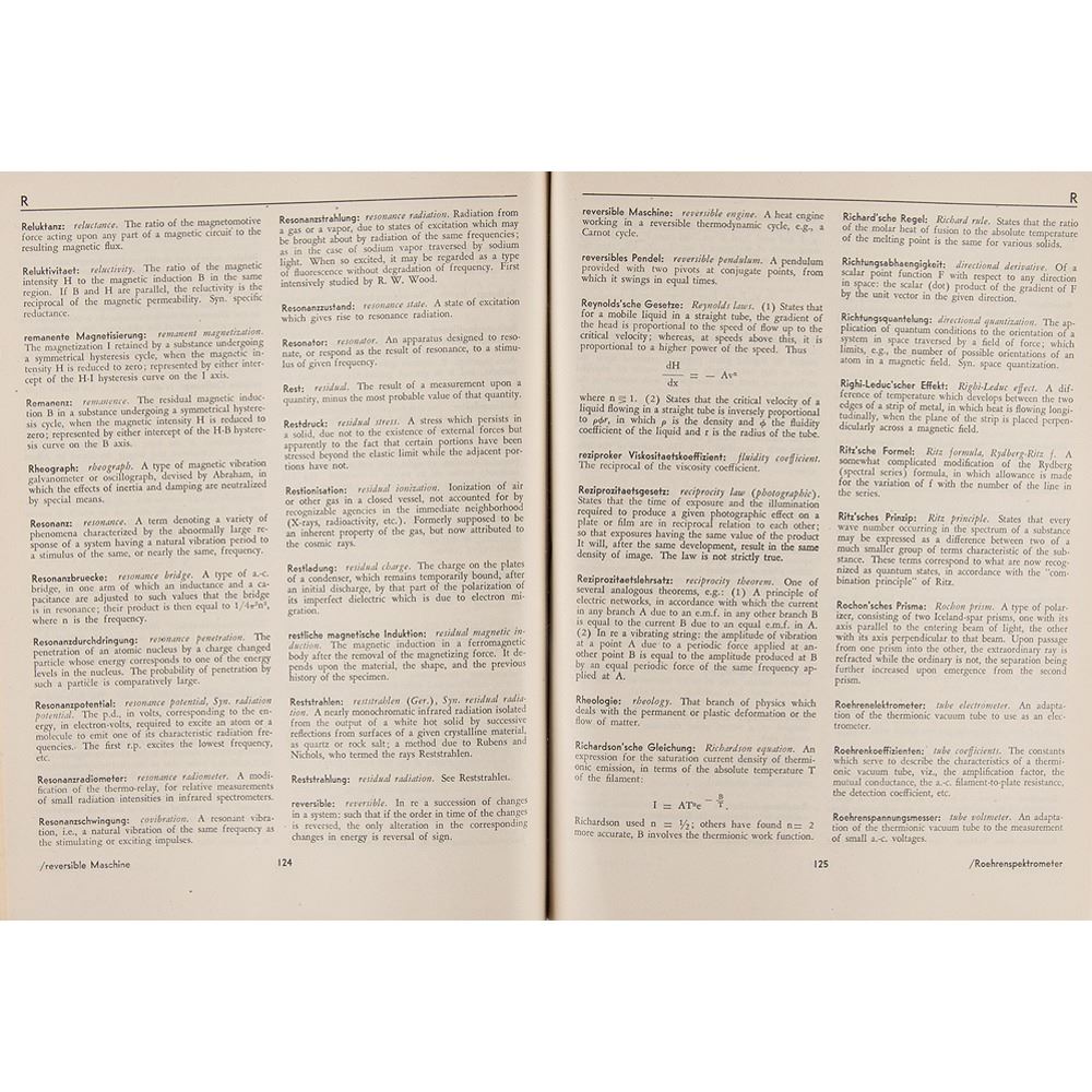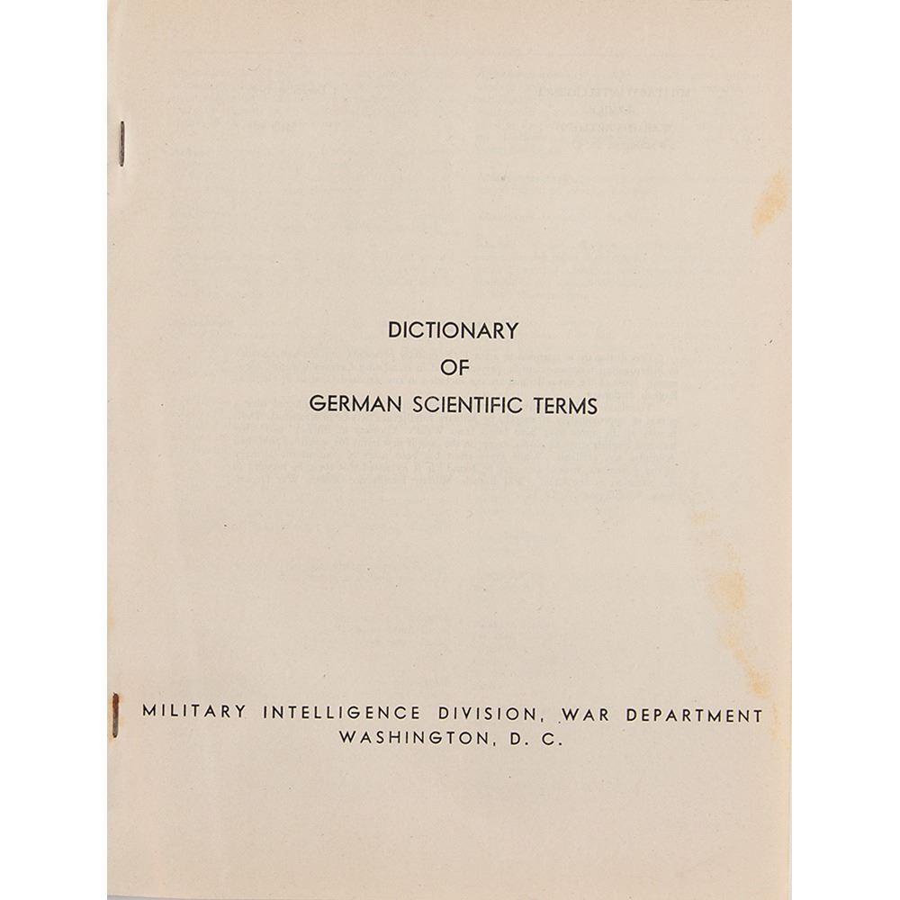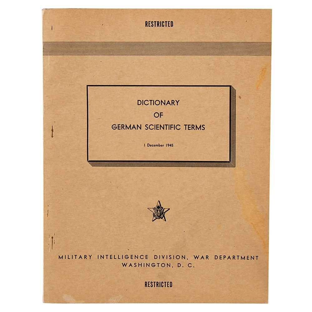 Booklet produced by the U.S. War Department’s Military Intelligence Division entitled “Dictionary of German Scientific Terms,” (MID 641), dated December 1, 1945, marked “Restricted” twice on the front cover, 169 pages, 8 x 10.25, containing a meticulous alphabetic collection of German science terms with their English translation and definition. An introductory notice reads, in part: “This dictionary is intended to assist U.S. military personnel and research agencies in interrogating German scientific personnel and in translating German scientific documents. Most of the terms defined are not included in any standard German or German-English dictionary.” In fine condition, with some light dampstaining to front cover and first page. An intriguing postwar document related to America’s salvaging of German researchers, a group that eventually included rocket scientist Wernher von Braun and a hundred of his key V-2 rocket personnel that emigrated to the United States in Operation Paperclip, where their knowledge was leveraged in the development of the Redstone missile.