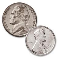23 COINS STRUCK IN SUBSTITUTE MATERIALS FOR THE WAR EFFORT. The U.S. Treasury was forced find substitute metals for minting cents. This 23-coin set contains 11 wartime silver nickels, Steel Cents and nine 1944 to 1946 bronze coins.