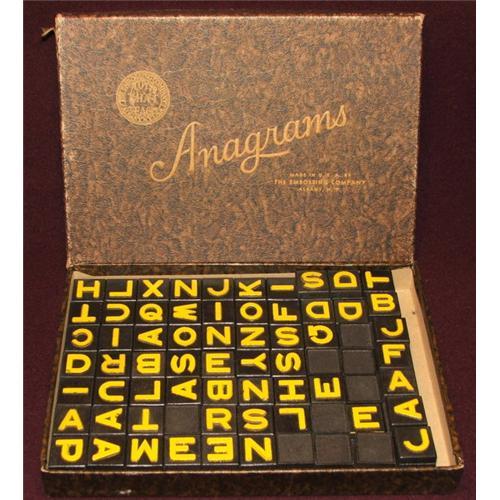 World War Two era Anagrams word game, with raised yellow letters on black, made by The Embossing Company of Albany, New York. The Embossing Company began making toys and games, including dominoes, checkers, and building blocks in 1870. The company motto, "Toys That Teach", is on the front of the game box in gold. The game has 149 tiles with yellow letters on black ("a color combination that eliminates eye strain") and an embossed diamond design on the back. The instructions and rules are printed on the back of the box cover, to save paper during World War Two. Condition is good to very good, with light surface wear; the box is intact, with the exception of two separated corners on the lid. Please refer to the 4 photographs for appearance and condition. Shipping / packaging will be $7.00 - $12.50, based upon the zip code of the buyer.