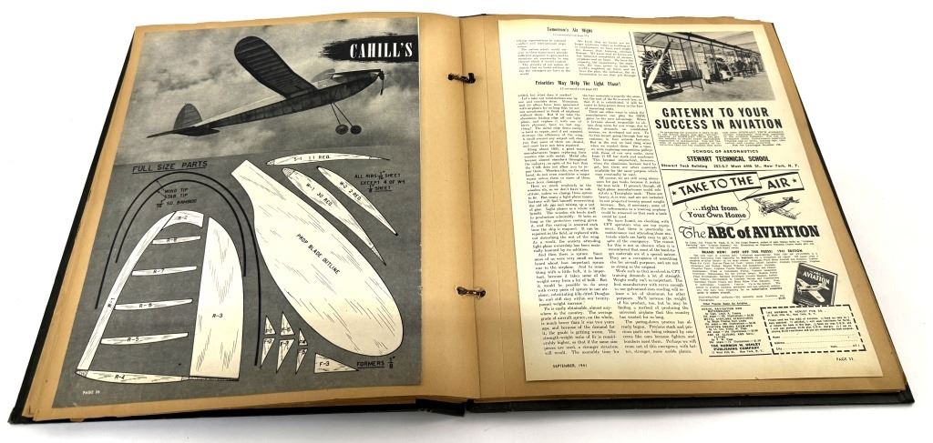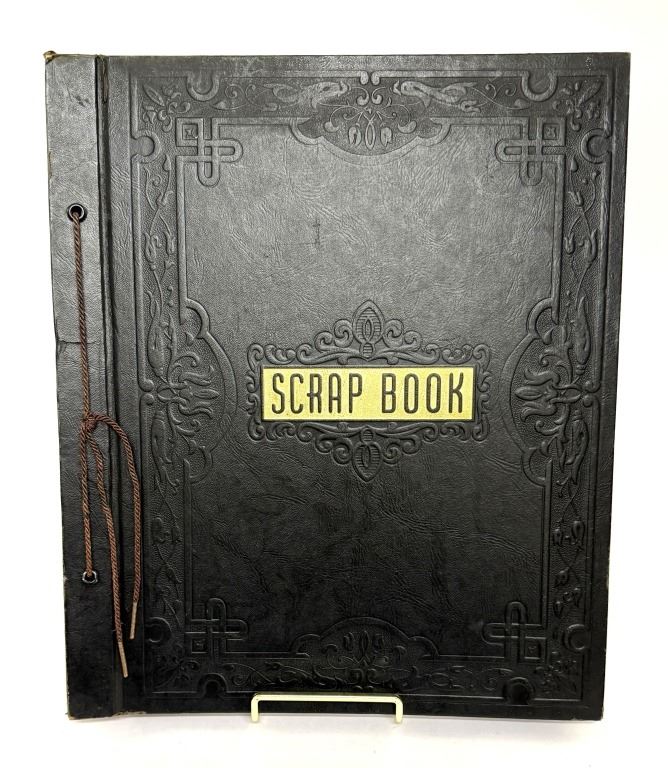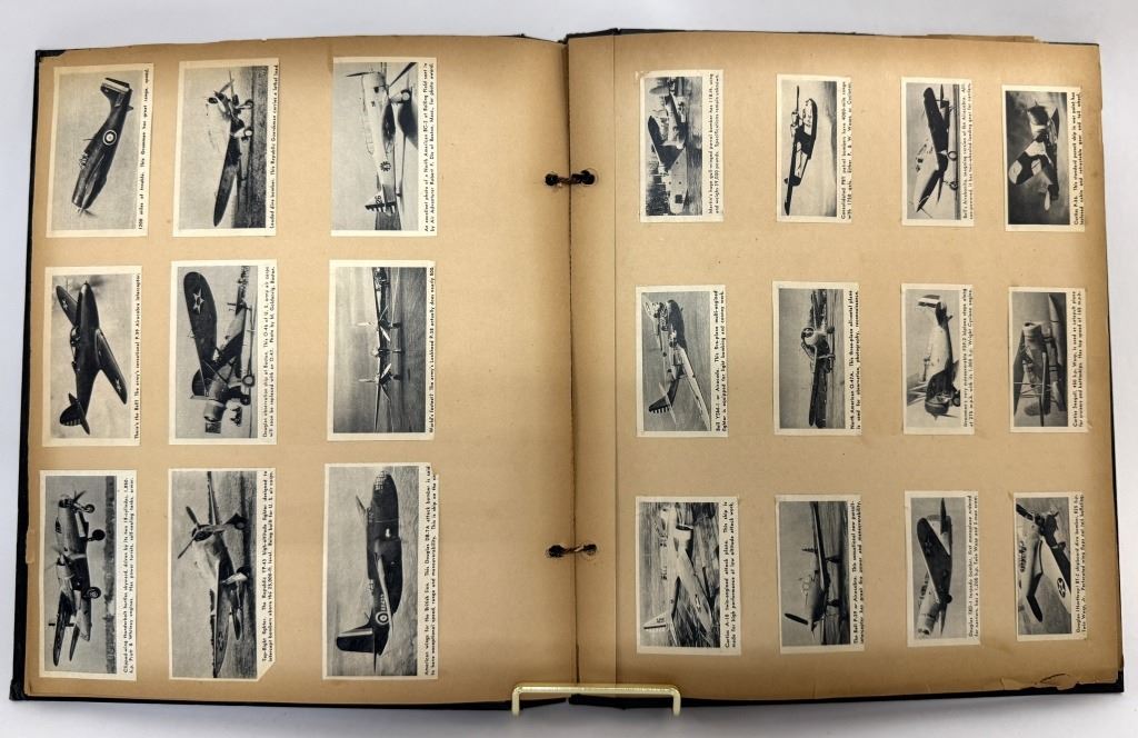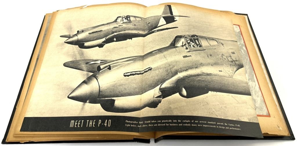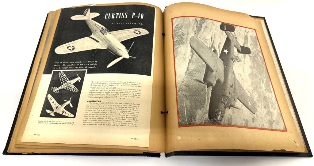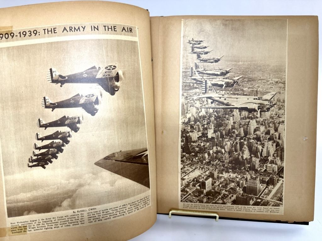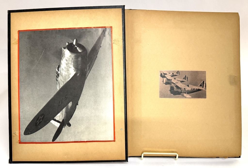 Item/Description: World War II era scrapbook featuring cutout pictures and magazine articles of military aircrafts. Features approximately 48 pages in a black, decorated faux leather hardcover scrapbook, fastened together with string. A unique piece of aviation militaria.