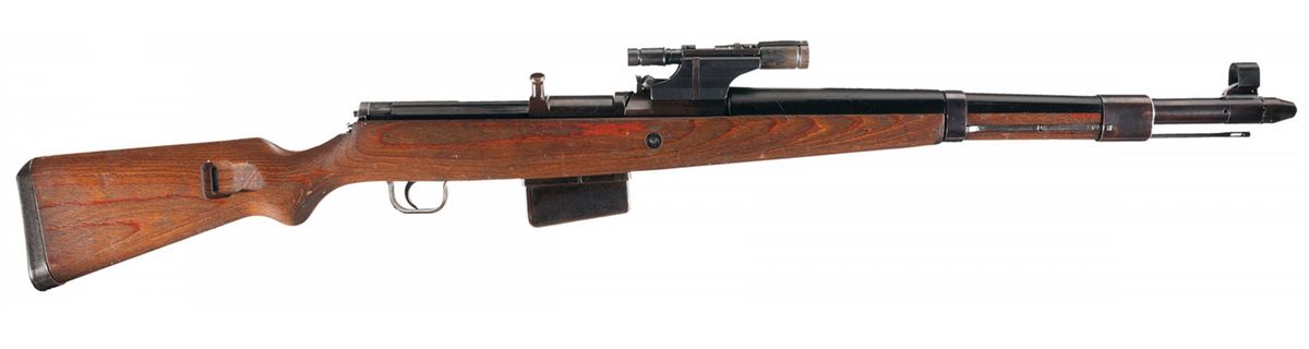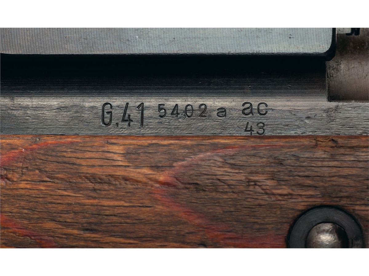 The G41 rifle was manufactured in a limited production during the early war years before being replaced with G/43/K43 rifles. G41s employed a gas trap system mounted on the end of the rifle barrel that was originally designed off of the Bang system which employed a full length operating rod. This semi-automatic function of this rifle and larger magazine capacity was highly desirable on the Eastern front. The left side of the receiver is marked "G.41" with the serial number and "ac/43". All machined parts, laminated stock and black resin (plastic) handguard. This rifle is fitted with a contemporary ZF 40 scope and mount. Author Peter R. Senich states, "No original (as first manufactured) ZF40 telescopic sights or WWII mounts of this type are known to have survived the war" (see page 315 of the book "The German Rifle 1914-1945"). The scope is marked on top "fzg" (Feinmechanik e. G.m.b.H., Kassel) and "+" over "ZF41/1" and has a set of sheet metal sun shades. The rear sight base has the machined in scope rails to use this type of straddle mount. The stock has a double Eagle 359 proof (very faint) below the sling slot on the left side and the serial number is on the underside. The rifle has a cleaning rod. All visible numbers, including the magazine, match.