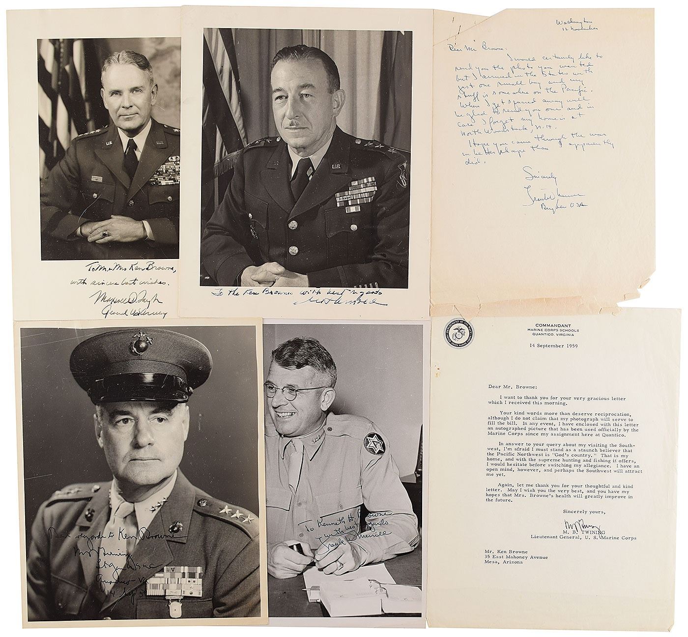 Grouping of six items signed by four American generals from World War II, consisting of letters and signed photos, all inscribed to "Ken Browne," including: William Howard Arnold (SP), Frank Merrill (2; ALS and SP), Maxwell D. Taylor (SP), and Merrill B. Twining (2; SP and TLS). In overall very good to fine condition. Accompanied by the original mailing envelope for the letter from Merrill, who addresses the envelope in his own hand.