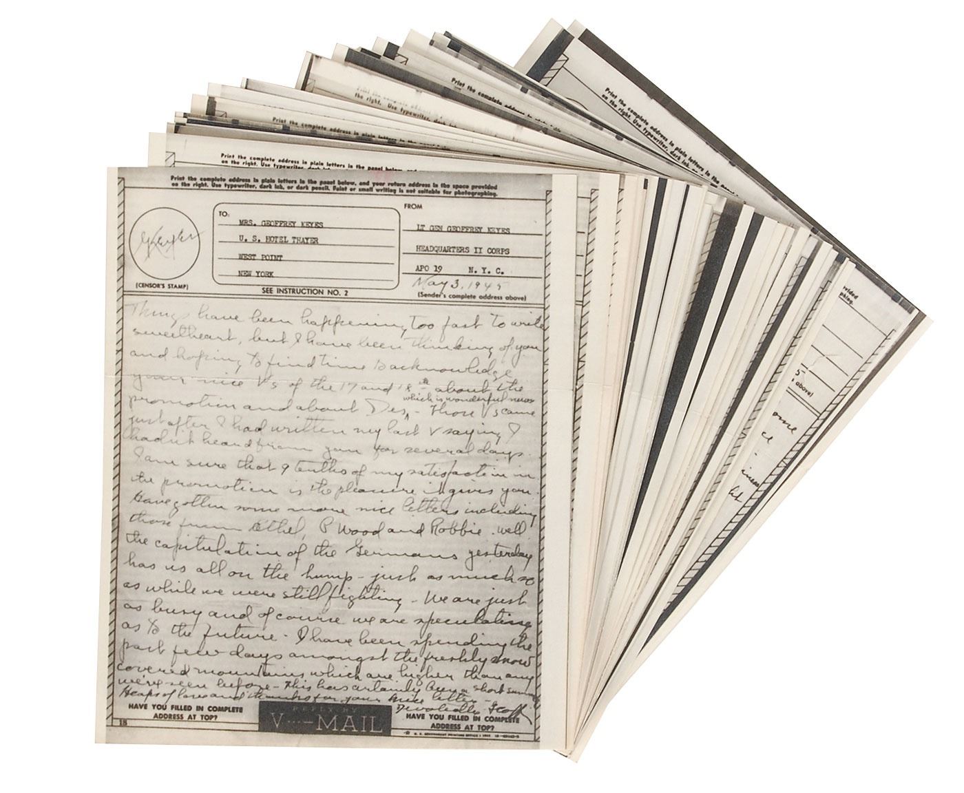 Large hand-colored and annotated map of western Germany, 22 x 29, dated June 4, 1945, from the collection of General Geoffrey Keyes. The map is entitled "Administrative Map, Western-Germany," and was printed by the 649th Engineer Topographic Battalion in Waiblingen-bei-Stuttgart. The landkreise, stadtkreis, and land boundaries are noted. Identified with flags are three Region Headquarters (Darmstadt, Marburg, Stuttgart) and five R.B. Headquarters (Frankfurt, Kassel, Wiesbaden, Mannheim, Karlsruhe). In very good to fine condition, with central vertical and horizontal folds, tack holes to corners, and light overall creasing. Accompanied by 25 pages of V-Mail from Lieutenant General Keyes to his wife, May–August 1945. The Berlin Declaration of June 5, 1945, confirmed the division of Allied-occupied Germany into four occupation zones according to the Yalta Conference. From the estate of Lieutenant General Geoffrey Keyes.