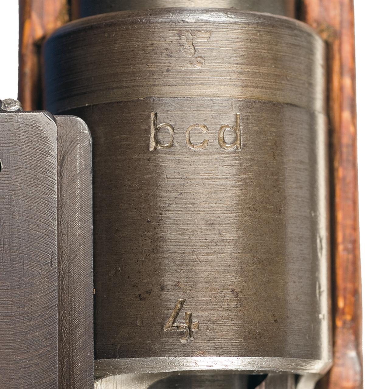 Condition: Very fine as partially refinished (triggerguard only), with 95% of the original phosphate finish on the barrel assembly, showing areas of scattered handling marks. The blue barrel bands are fine, with 50% original finish, a brown patina and some scratching and spotting. Stock is fine, with a non-matching upper handguard and a number of chips and dents. Some dings are visible on the case, with cracking of the leather strap. Mechanically excellent.