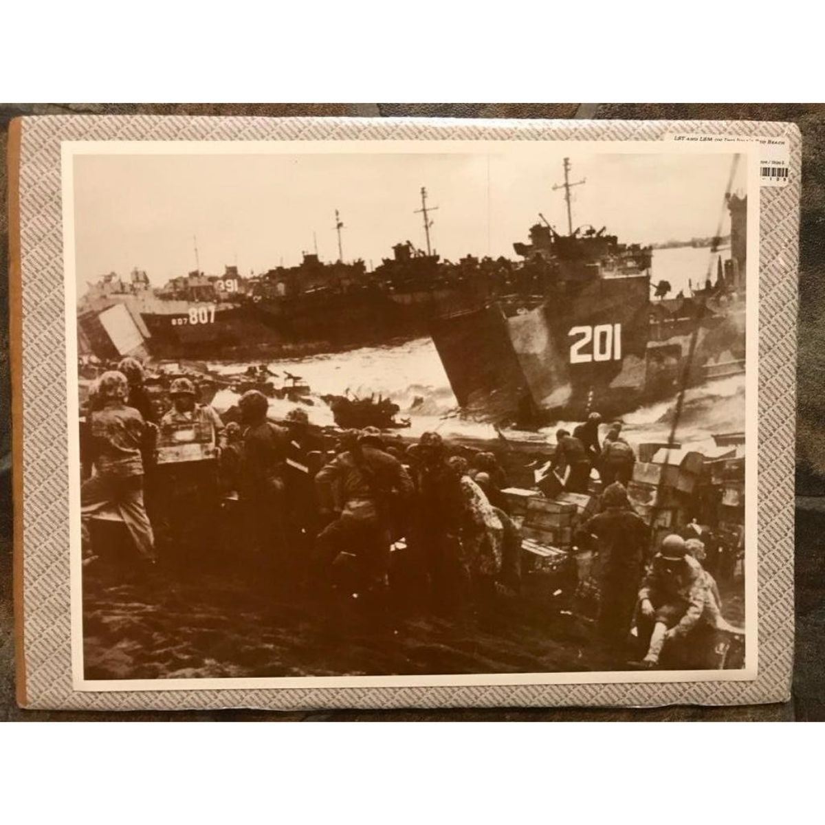 World War II LST and LSM, Landing on Iwo Jima's Red Beach c. 1945. Sepia-tone photo print, created in the early 1990's for The American Heritage Galleries. Printed on heavy cardstock, in original packaging. 11" X 14".Â