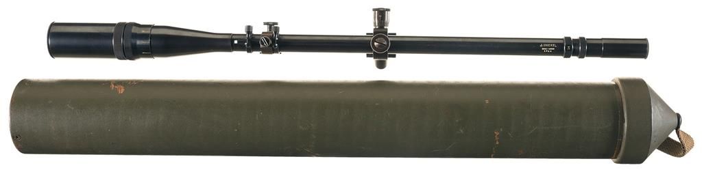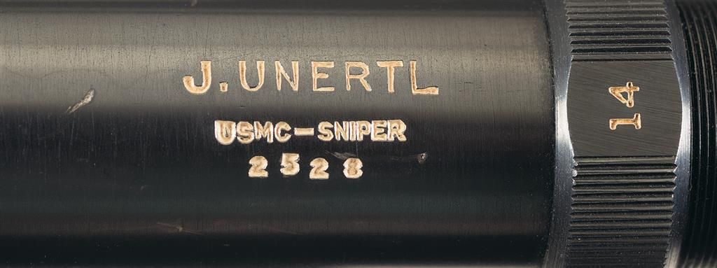 John Unertl developed and manufactured these scopes in 1940-41 under contract for the USMC. The scopes had 8x magnification and were originally intended to be mounted on Springfield Armory Model 1903 National Match rifles that were modified by USMC/Navy armorers. These sniper rifles were used in early 1942-43 during the initial invasions of the Japanese held islands. They were very effective at the start of the war, however, their higher magnification became a hindrance in the close jungle fighting. After WWII these scopes remained in USMC inventory and were again used very successfully throughout Korea, and then again in Vietnam from 1962-68 where they were mounted on Winchester Model 70 target rifles. There were approximately 2,800 of these scopes manufactured this example being a fairly late example. The rear of the scope tube is roll marked "J. Unertl/ USMC-SNIPER/2528" and it is marked with "14" on the outside reticle holding ring indicating 14x magnification. This scope is accompanied with an original WWII issue micarta scope can, dark green scope mounts and screw on aluminum lens caps.