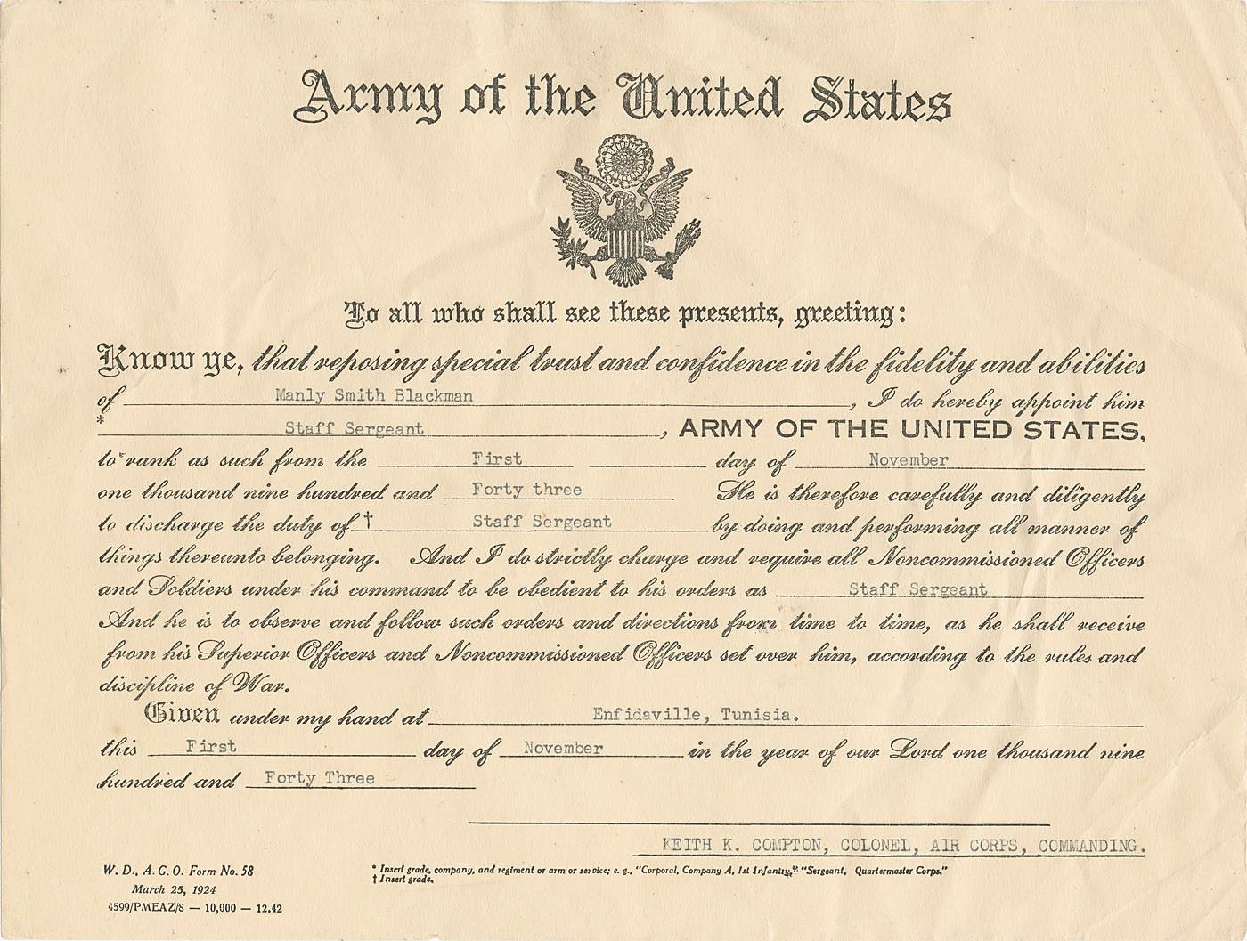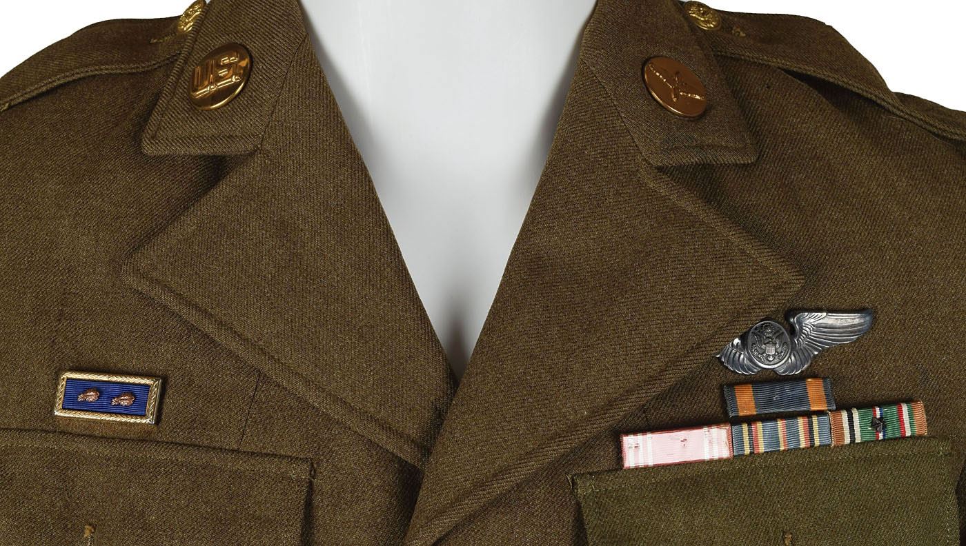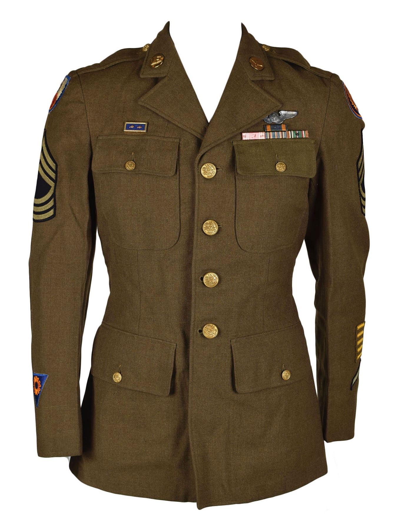World War II airman's jacket of Master Sgt. Manly S. Blackman, who was assigned to the 376th Heavy Bombardment Group in Tunisia. Blackman was taken as a prisoner of war and held at Stalag-17 near Krems, Austria, from where he was liberated in May 1945. The jacket is size 35L, and it is adorned on the left breast with ribbon bars (one with a service star) and USAF air crew pilot's wings. The right breast features a blue bar ribbon with two bronze oak leaf clusters. The sleeves have chevron rank patches as well as embroidered shoulder patches for the 9th Air Force and 15th Air Force. Includes a 1943 document filled out in type, appointing Blackman as staff sergeant, authorized by Keith K. Compton. In fine condition. The story of the American airmen held near Krems inspired the 1953 comedy-drama war film Stalag 17, which starred William Holden in an Osar-winning role.