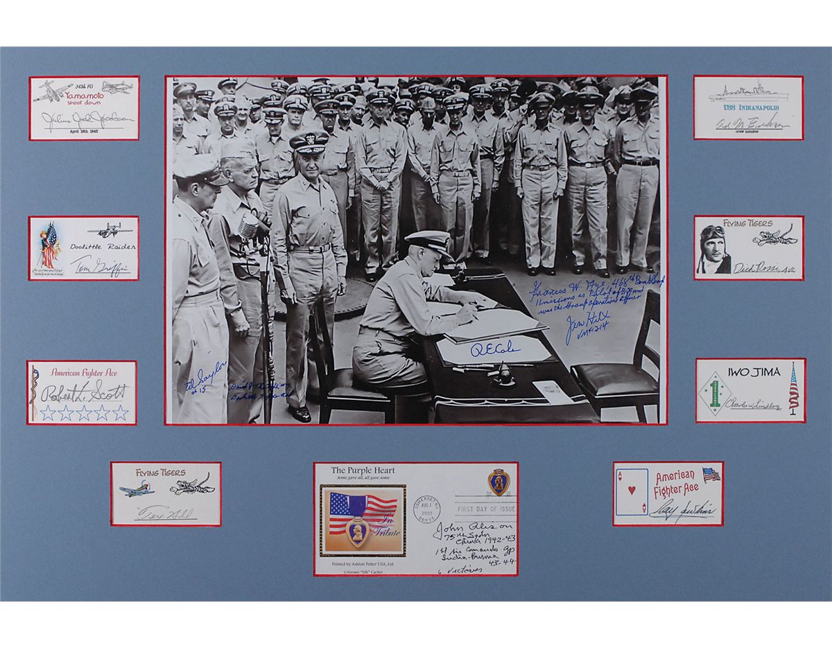 Collection of items consisting of a signed photo, an FDC, and pencil and ink signatures. A glossy 16 x 11 photo of the signing of the Japanese surrender, signed in blue felt tip by Ed Saylor, David Thatcher, R. E. Cole, General Francis Nye, and Jim Hill; FDC signed by General John Alison; and signatures of Julius Jacobson, Tom Griffin, Robert L. Scott, Tex Hill, Arthur Ray Hawkins, Charles W. Lindberg, Dick Rossi, and Ted Erikson on individual white custom-made collector’s cards. All are double-matted together to an overall size of 26 x 17. In fine condition. Oversized.