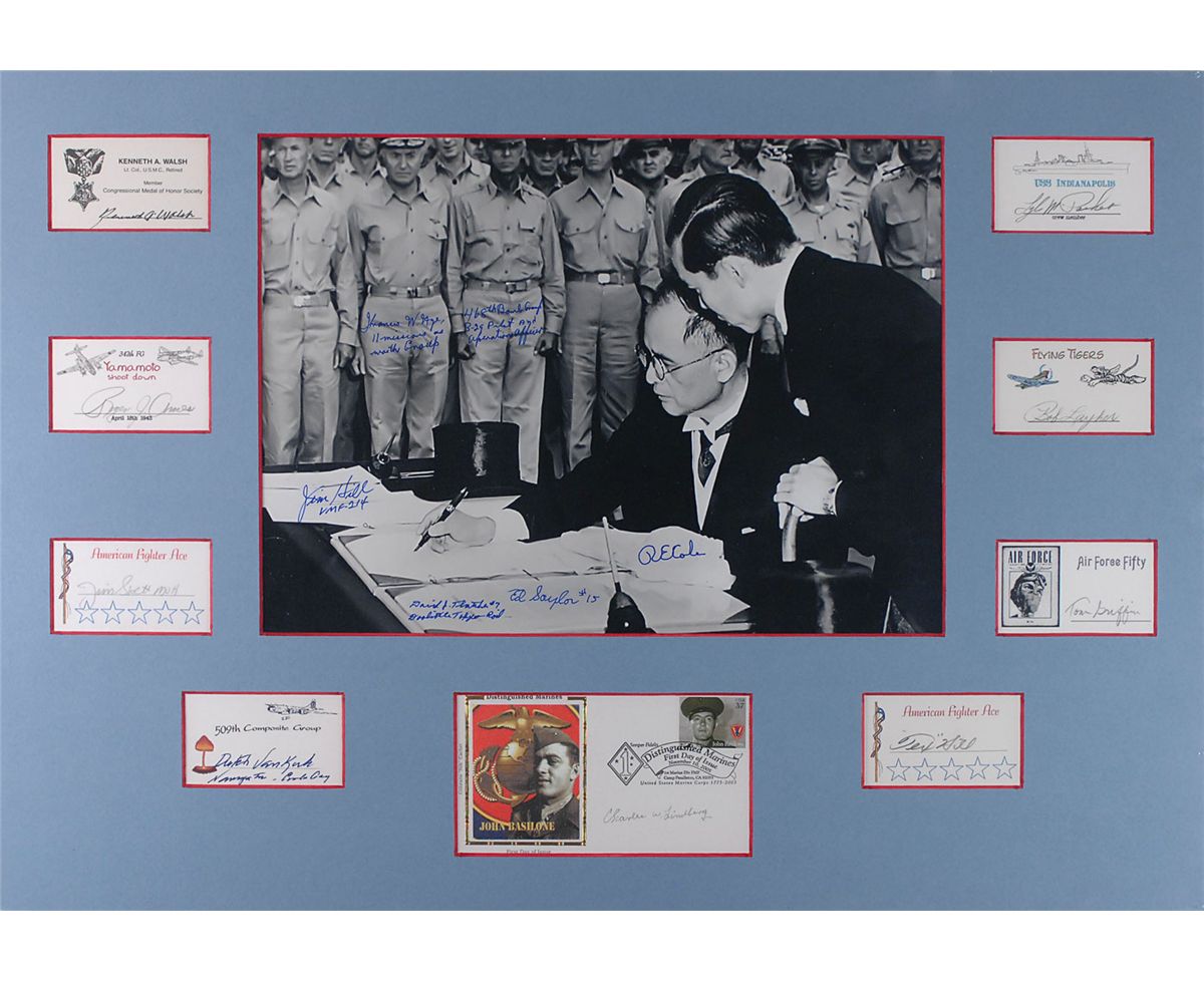 Collection of items consisting of a signed photo, commemorative covers, and pencil and ink signatures. A glossy 14.5 x 10.5 photo of the signing of the Japanese surrender, signed in blue felt tip by Ed Saylor, David Thatcher, R. E. Cole, General Francis Nye, and Jim Hill; commemorative cover signed in pencil by Charles W. Lindberg; and signatures of Ken Walsh, Roger Ames, Jim Swett, Dutch Van Kirk, Tex Hill, Tom Griffin, Bob Layher, and Lyle M. Pasket on individual white custom-made collector’s cards. All are matted together to an overall size of 26 x 18. In overall fine condition. Oversized.