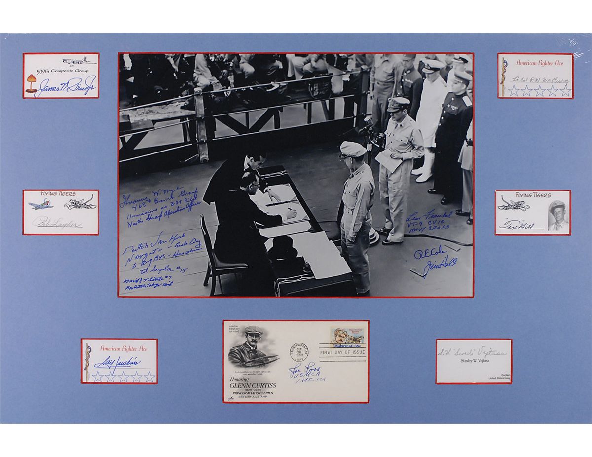 Collection of items consisting of a signed photo, commemorative cover, and pencil and ink signatures. A glossy 15.25 x 10.5 photo of the signing of the Japanese surrender, signed in blue felt tip by Dutch Van Kirk, Ed Saylor, David Thatcher, R. E. Cole, Leon Frankel, Francis Nye, and Jim Hill; FDC signed in blue felt tip by Joe Foss; and signatures of James N. Price, Jr., Bob Layer, Arthur Ray Hawkins, S. W. ‘Swede’ Vejtasa, Tex Hill, and R. W. McClurg on individual white custom-made collector’s cards. All are matted together to an overall size of 26 x 17. In overall fine condition. Oversized.