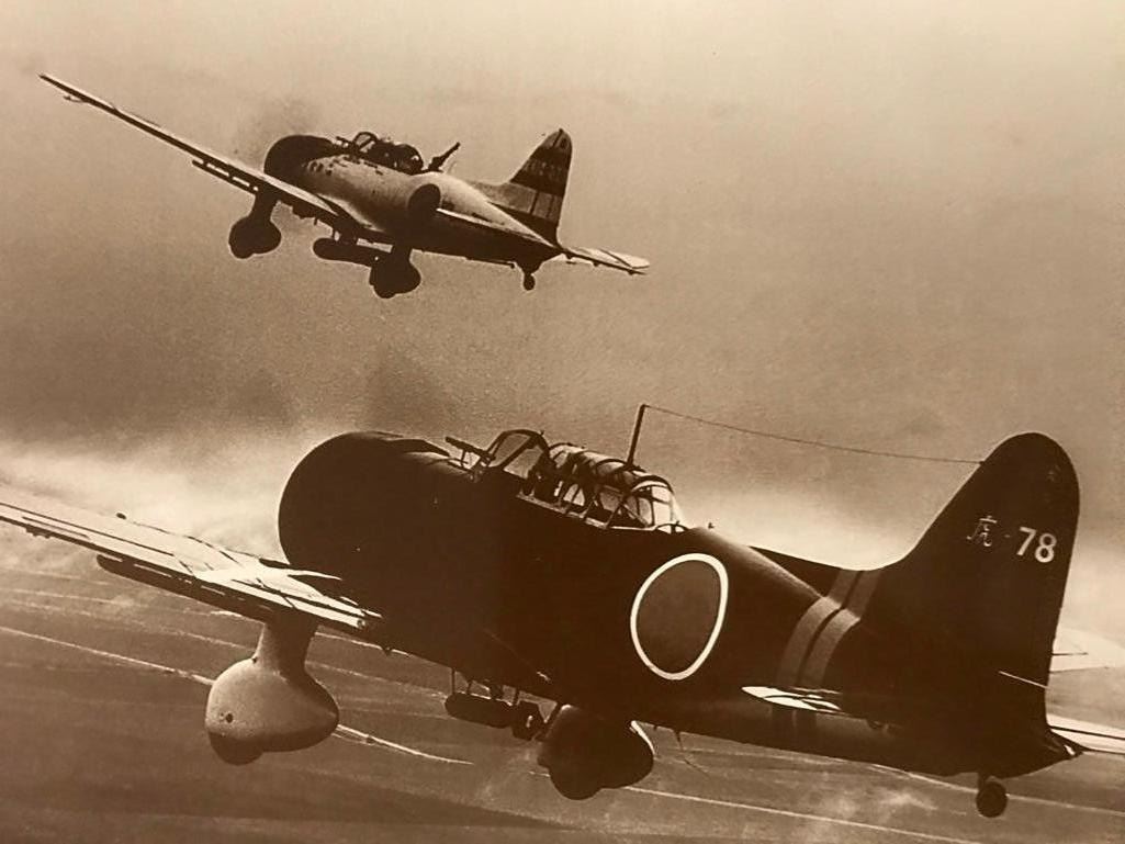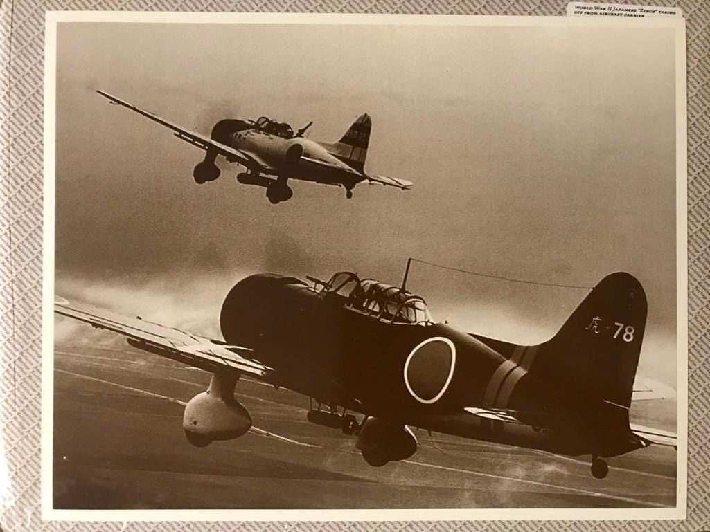 World War II Japanese Zeros taking off from aircraft carrier, sepia-tone photo print. Created in the early 1990's for The American Heritage Galleries. Printed on heavy cardstock. 11" X 14" in original packaging.Â