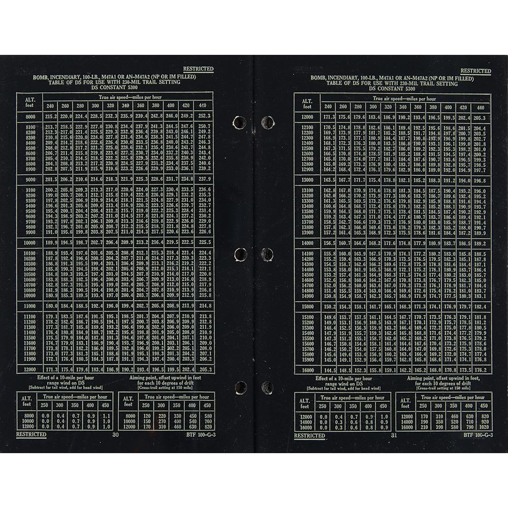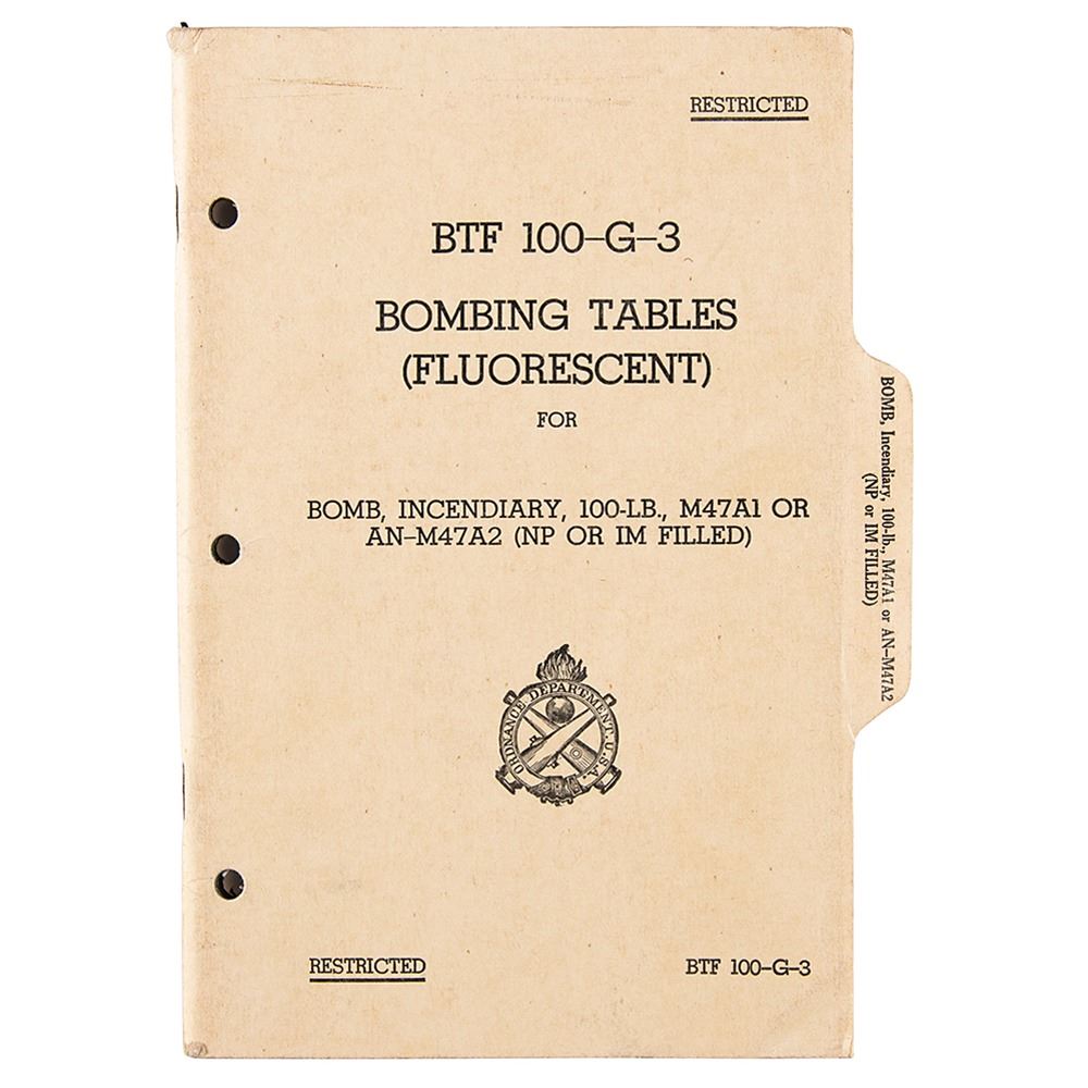 Interesting US Army booklet entitled "BTF 100-G-3, Bombing Tables, (Fluorescent) for Bomb, Incendiary, 100-lb, M47A1 or AN-M47A2 (NP or IM Filled)," 6 x 8.5, 50 pages, February 16, 1945, interestingly printed with fluorescent ink on black paper so that the tables may be read in the dark by use of ultraviolet light. This was done in order to preserve the pilots' night vision. In fine condition.