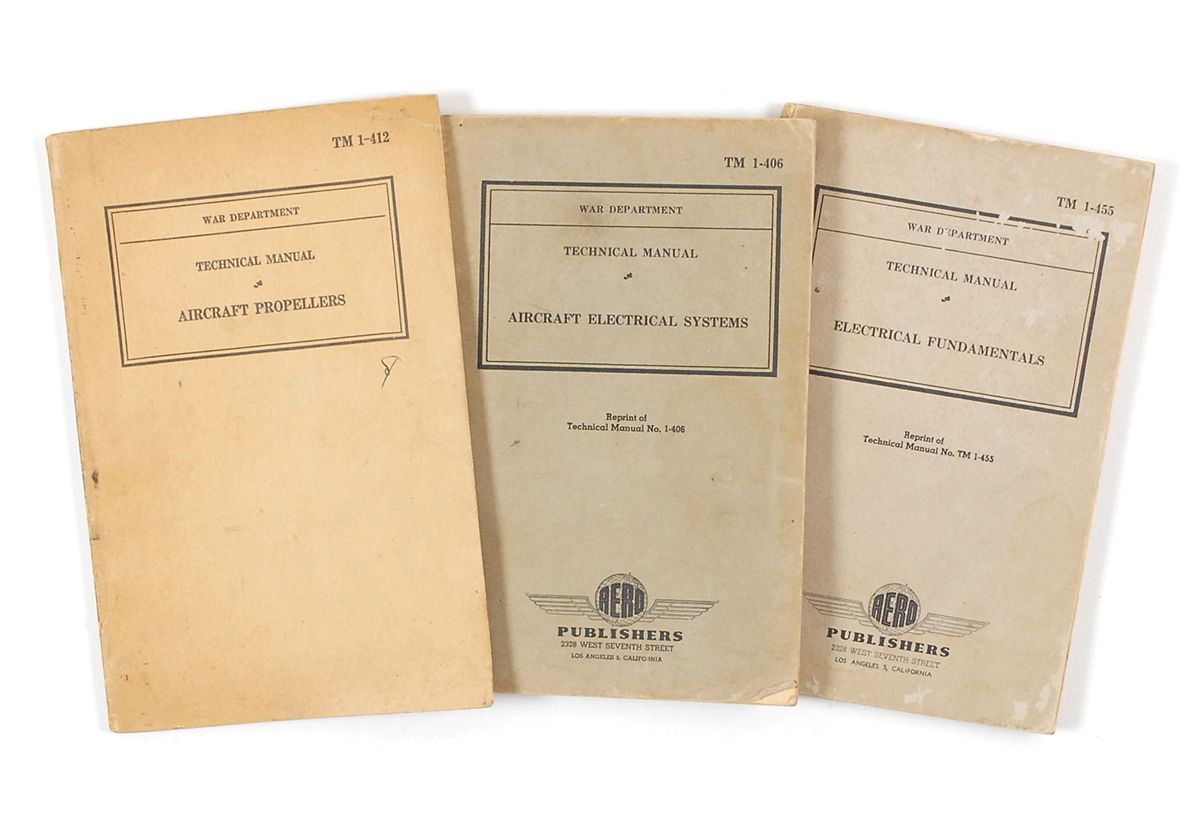 Three World War II technical manuals issued by the War Department. Titles are: Aircraft Electrical Systems (TM 1-406), Electrical Fundamentals (TN 1-455), and Aircraft Propellers (TN 1-412). Detailed manuals are full of instructions, photos, and schematics on their respective topics. In very good condition, with scattered toning and foxing.
