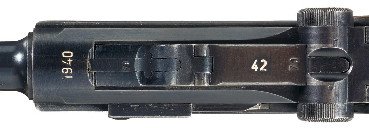 Fixed sights, with the chamber dated "1940" and the toggle marked "42". A pair of "eagle/ 655" proofs are on the right side of the extension next to the firing proof, which is repeated on the barrel and breechblock. Matching numbers on the barrel, extension and frame, with matching partial numbers on the small parts. Standard "GELADEN" and "GESICHERT" markings on the extractor and upper safety area. Checkered grips and blue magazine with aluminum base.