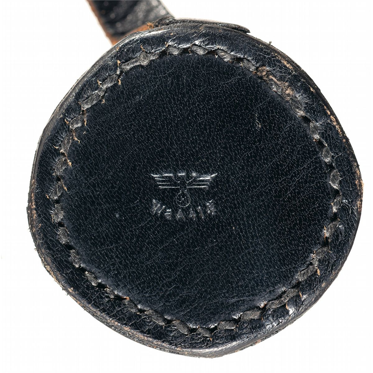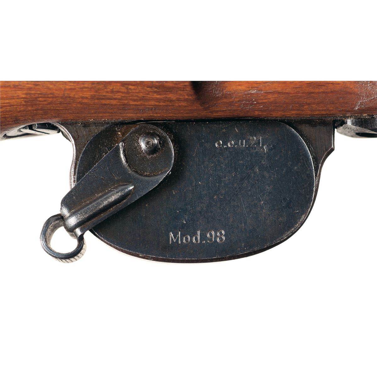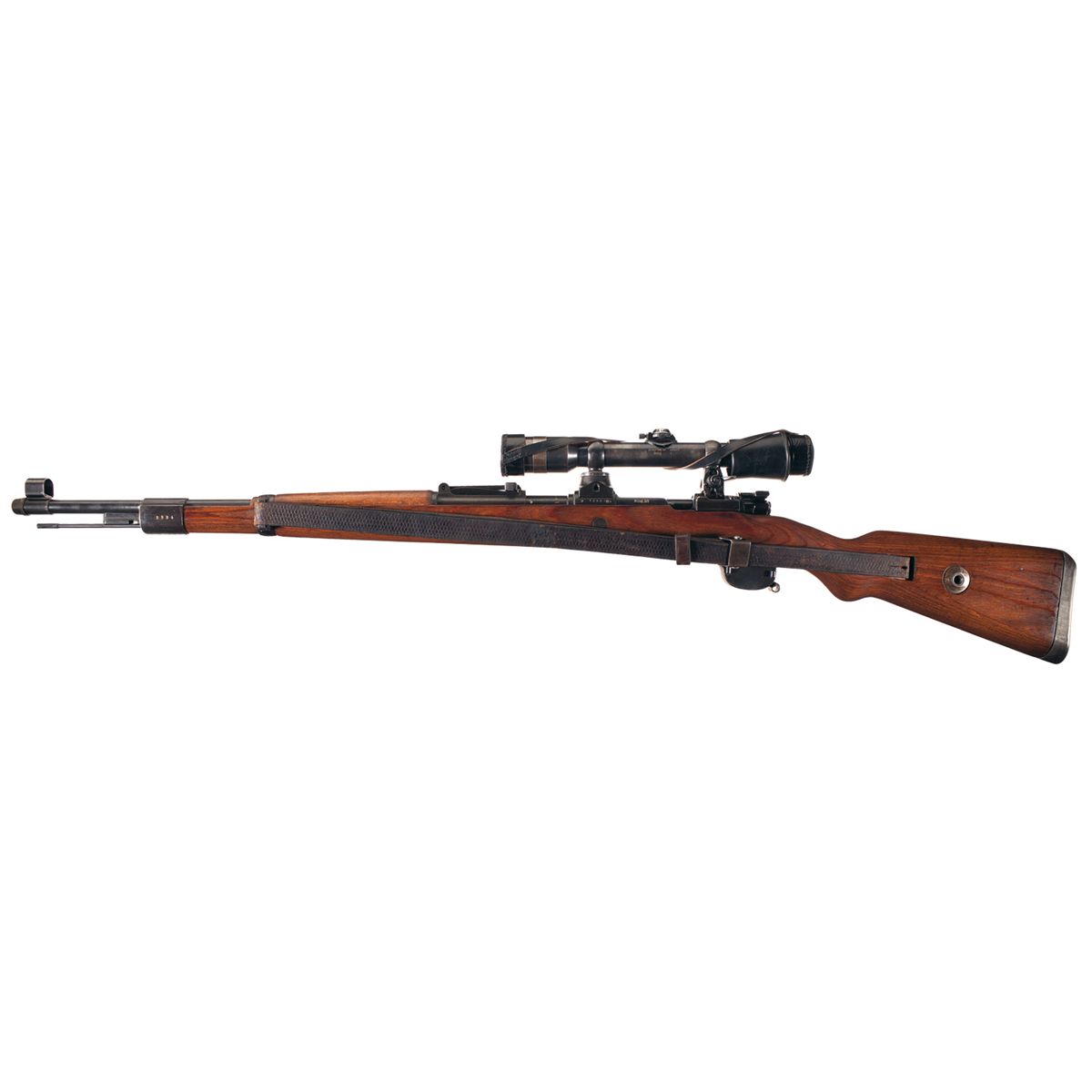 This is a nice example of a scarce original WWII Nazi low turret sniper rifle manufactured by the Mauser factory that has been fitted with a Dialytan 4x sniper scope. The turret mount rifles were considered the most efficient design of the K98 rifles and they were in service from 1939 to the end of the war. The top of the receiver ring is covered by the front turret, the right side of the receiver is marked with a single "eagle 135" proof and the left side has a "eagle 135" and Nazi firing proofs flanking the serial number, with the receiver side wall marked "Mod. 98". The left rear of the barrel is marked with a Nazi firing proof and "3D632" "eagle/135" proof along the top. The left side of the rear scope base is marked with an "eagle/135" proof. The rifle has a milled trigger guard, floor plate, rear barrel band and stamped front barrel band. The matching bolt is a correct war time version with the milled safety. The rifle is fitted with an early all blued sniper scope made by the Hensoldt scope company with the left side of the tube marked "DIALYTAN 4x/bmj" and "69472/cross". It has the correct style sniper elevation knob that is graduated from 100-800 meters, with the front ring numbered "365". With a set of "WaA414" (Ernst Leitz, Wetzlar) Waffenamt stamped lens caps. The rifle is equipped with a hooded ramp front sight and tangent rear sight graduated to 200 meters, steel cleaning rod with slotted head, and winter trigger guard. Mounted with a walnut stock and hand guard with a cupped buttplate and original brown leather sling. The right side of the buttstock is marked with a "eagle/WaA135" proof and the same proof in the grip area as well as a firing proof.