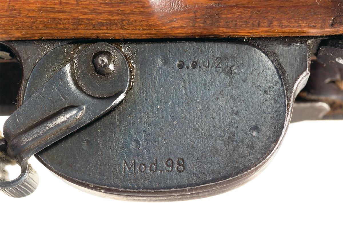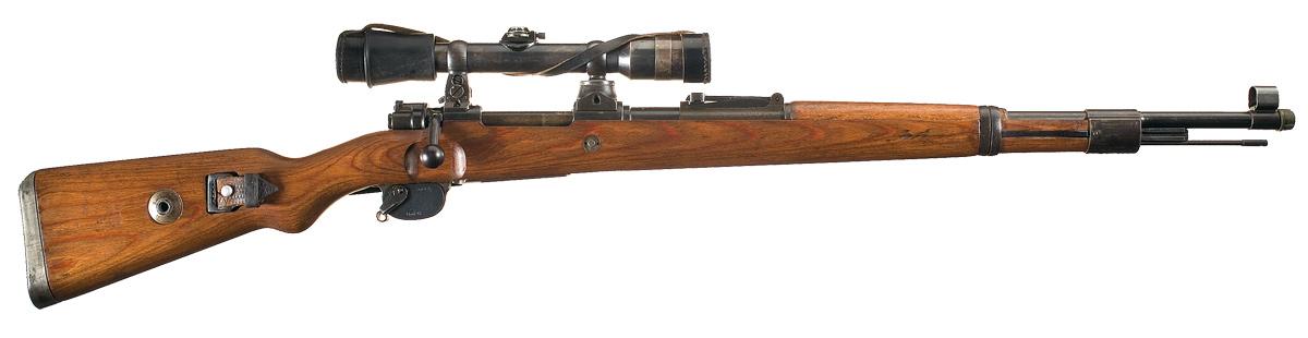 This is a nice example of a scarce original WWII Nazi low turret sniper rifle manufactured by the Mauser factory that has been fitted with a Dialytan 4x sniper scope. The turret mount rifles were considered the most efficient design of the K98 rifles and they were in service from 1939 to the end of the war. The top of the receiver ring is covered by the front turret, the right side of the receiver is marked with a single "eagle 135" proof and the left side has a "eagle 135" and Nazi firing proofs flanking the serial number, with the receiver side wall marked "Mod. 98". The left rear of the barrel is marked with a Nazi firing proof and "3D632" "eagle / 135" proof along the top. The left side of the rear scope base is marked with an "eagle / 135" proof. The rifle has a milled trigger guard, floor plate, rear barrel band and stamped front barrel band. The matching bolt is a correct war time version with the milled safety. The rifle is fitted with an early all blued sniper scope made by the Hensoldt scope company with the left side of the tube marked "DIALYTAN 4x / bmj" and "69472 / cross". It has the correct style sniper elevation knob that is graduated from 100-800 meters, with the front ring numbered "365". With a set of "WaA414" (Ernst Leitz, Wetzlar) Waffenamt stamped lens caps. The rifle is equipped with a hooded ramp front sight and tangent rear sight graduated to 200 meters, steel cleaning rod with slotted head, winter trigger guard and mounted with a walnut stock and hand guard with a cupped buttplate and original brown leather sling. The right side of the buttstock is marked with a "eagle / WaA135" proof and the same proof in the grip area as well as a firing proof.