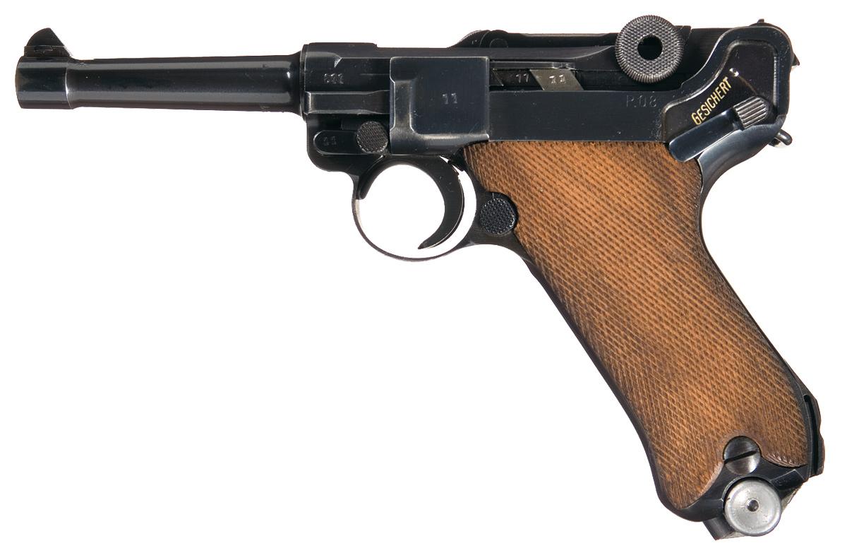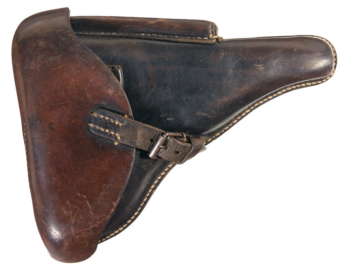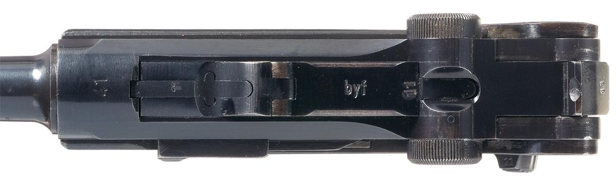 Dated "41" over the chamber, with "byf" code on the toggle. Marked "22" on the toggle pin, with matching numbers on the barrel, extension and frame, matching partial numbers on the takedown latch, side plate, trigger, sear, safety components, toggle links, extractor, breechblock and firing pin. "Eagle/ 135" and "eagle/swastika" proofs on the extension, with the firing proof on the barrel and breechblock and "eagle/ 355" on the barrel. Checkered walnut grips. Blue magazine with aluminum base. With a brown leather flap holster marked "P.08", "epf/ 1941" and "WaA195" on the back.