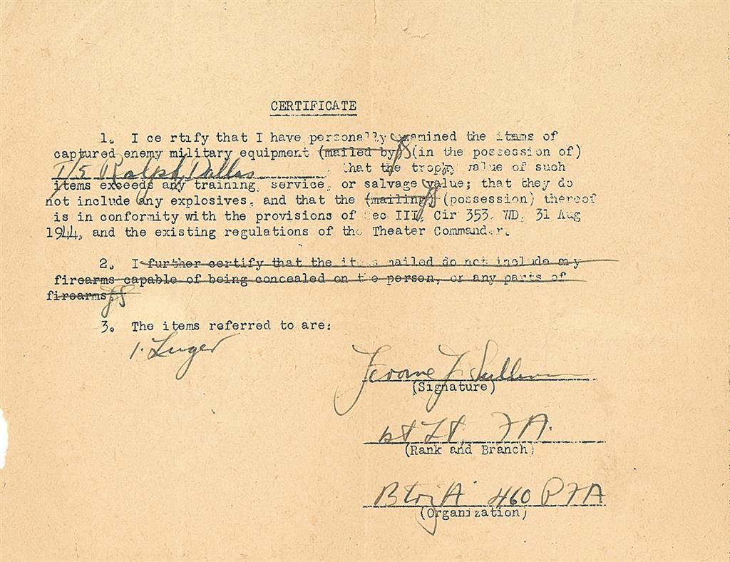 Fixed sights, with "41" on the chamber and "byf" on the toggle. "Eagle/655" marked extension and barrel, with firing proofs on the extension, barrel and breechblock, and "P.08" on the frame. Magazine unmarked, otherwise the external numbers match. Checkered grips, with blue finished plastic base magazine. With a pair of capture certificates listing a "Luger" to a T5 Ralph Dallas, and an unsigned hand written note, presumably from T5 Dallas, stating that this pistol was procured during Operation Dragoon, the Allied invasion of Southern France.