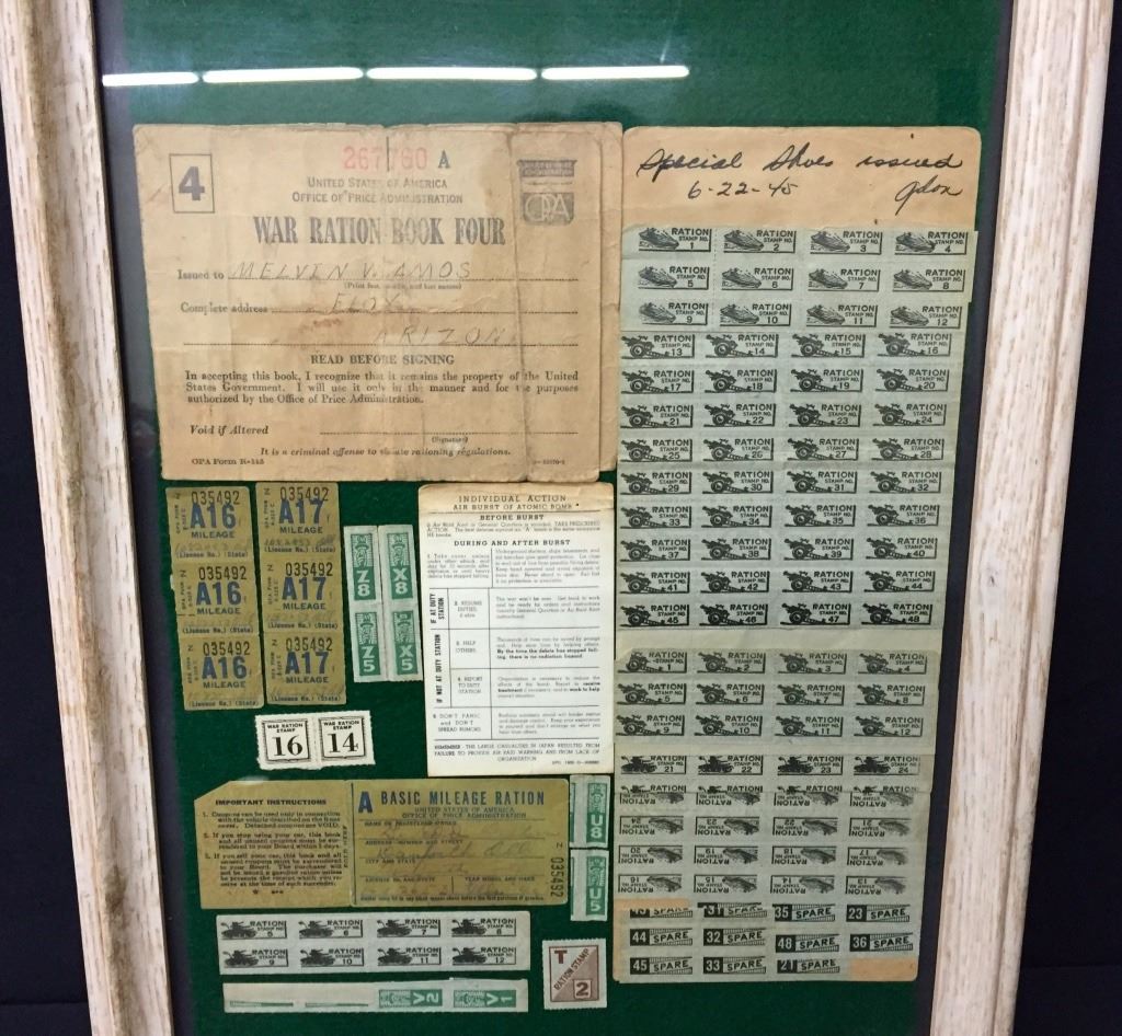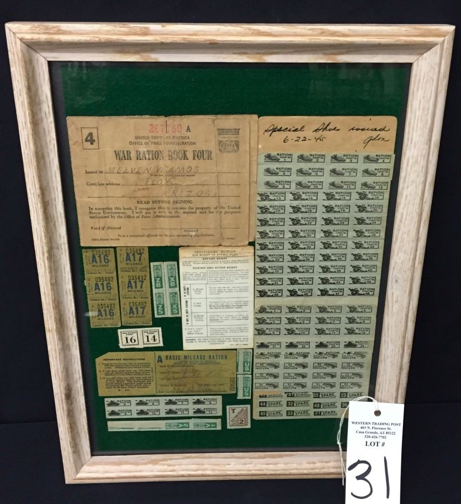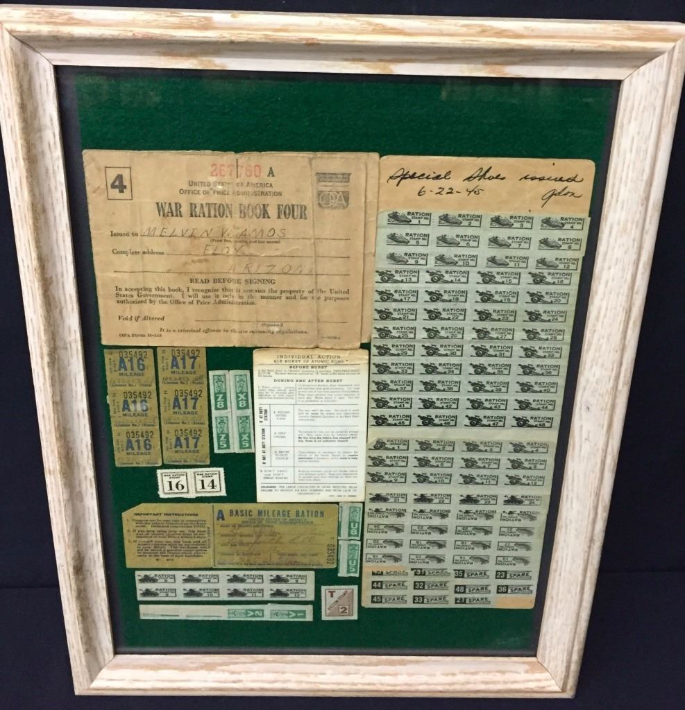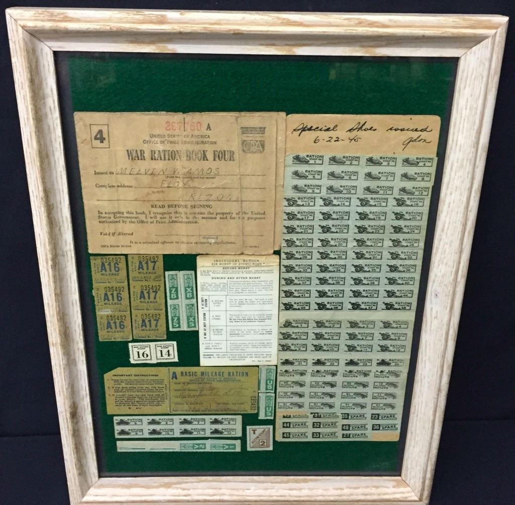 There are numerous items including World War II ration stamp books and various stamps for different restricted items. All are framed and under glass. Frame measures 12” wide by 17” high. Please look closely at the pics as they are an important part of our description. Shipping: There will be a $7 handling / packaging fee for shipping this lot. The actual cost of postage will be added on top of that.