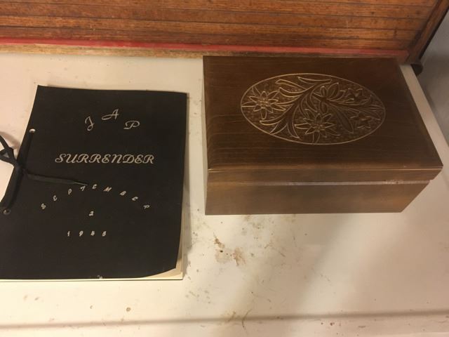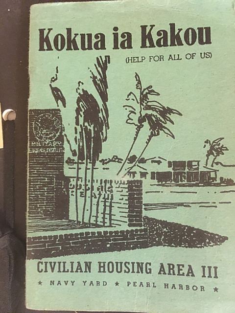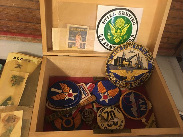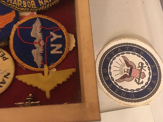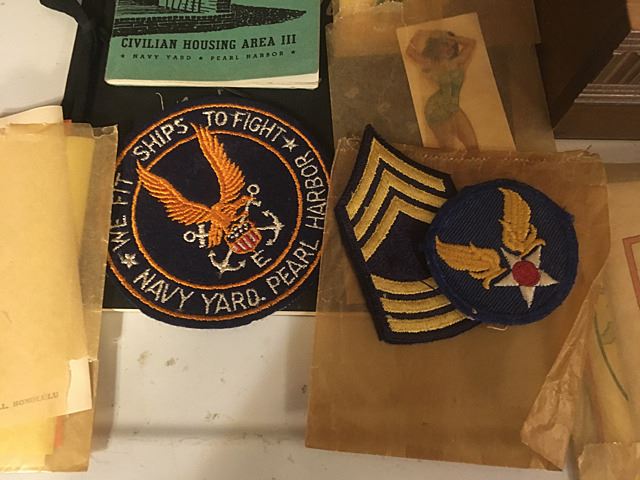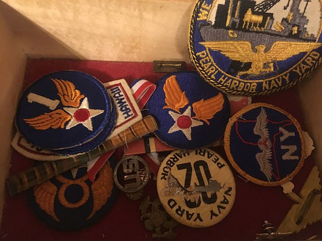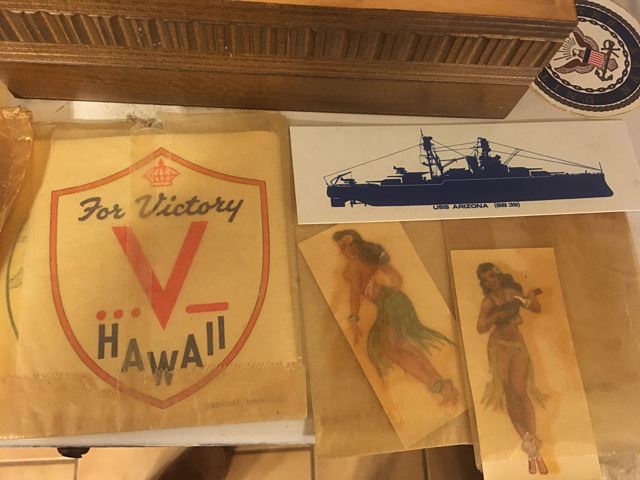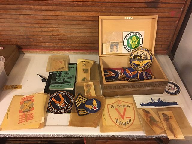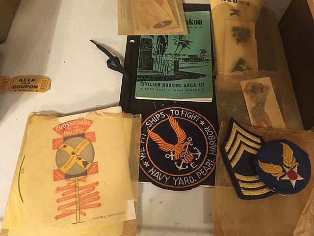 Estate collection of World War II Memorabilia including Navy patches and pins, Hawaiin, Victory and Navy stickers, Kokua ia Kakou Civilian Housing Area II, Navy Yard, Pearl Harbor handbook, Pearl Harbor memorabilia, Jap Surrender booklet, September 2, 1945, etc.