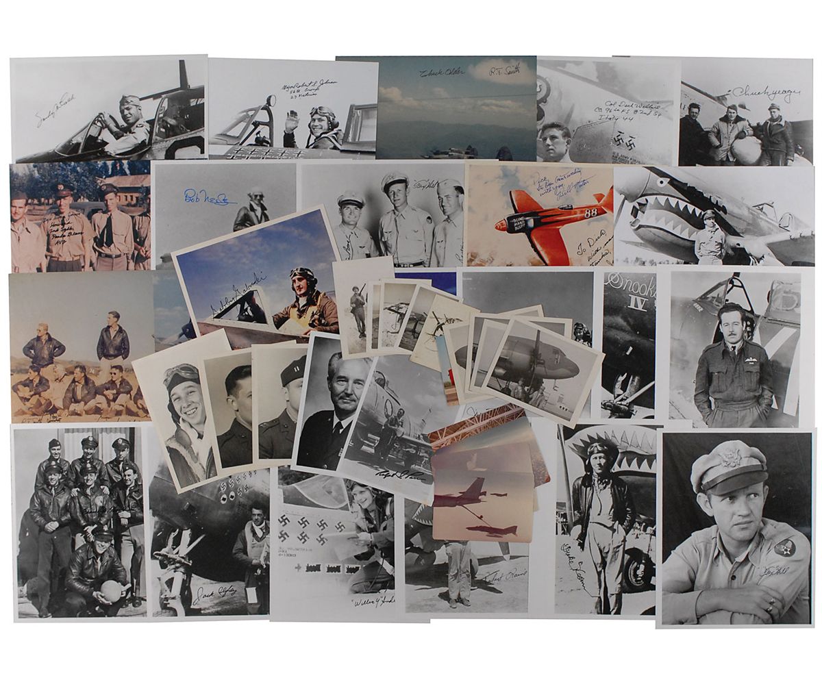 Collection of approximately 69 signed items, primarily individual and crew photos, along with news clippings, articles, covers, unsigned photos and candid snapshots, and two flown flags, all housed in two three-ring binders. Signers include: William Anderson, Bob Barkey (2), Jacob Besser, Charlie Bond, Bill Bower, Jim Brooks, Gerald Brown, R. E. Cole, Pete Everest, Joe Foss, Gabby Gabreski, R. E. Galer (2), Adolf Galland, John Griffith, Mark Hanna, Ray Hanna, Robert Hedman, ‘Tex’ Hill, Frank Hurlbut, Ken Jernstedt, Johnnie Johnson, Robert S. Johnson, William Knight, Link Laughlin, Jack Lifrey, Larry March, Carrol McColpin, Bob Neale, Fred J. Olivi, Ralph Parr (4), Hank Potter, Robert Raine, Ed Rector, Milton Reynolds, Saburo Sakai (2), Robert L. Scott (2), William Sloan, R. T. Smith (2), Charles Sweeney, Paul Tibbets, Chuck Yeager, and Hubert Zemke. Also included are unsigned snapshots from various air shows and exhibits; candid photos from the field, including soldiers manning an anti-aircraft gun; a printed fabric American flag flown on a sortie over Afghanistan; and a small printed fabric American flag flown above 70,000 feet on a U-2S aircraft in 1999. In fine condition.