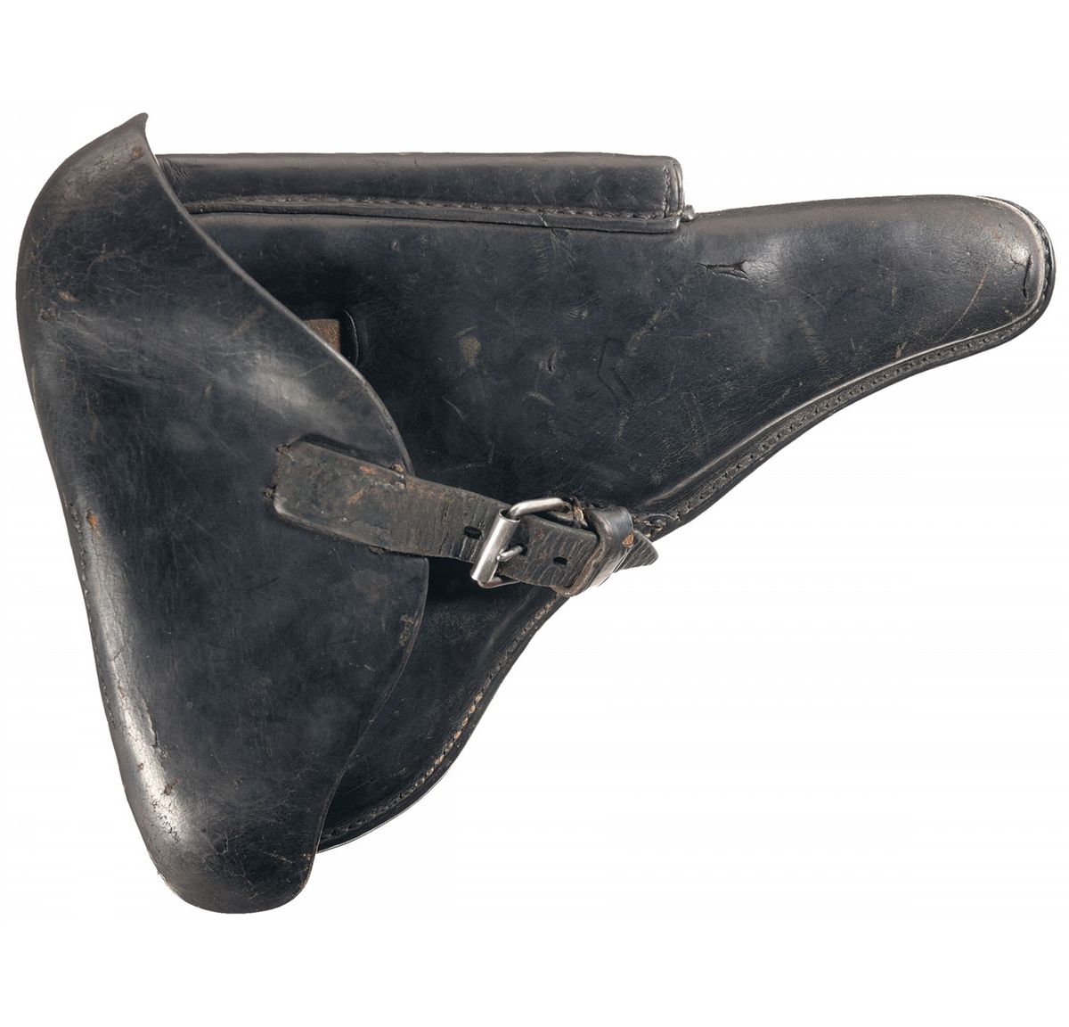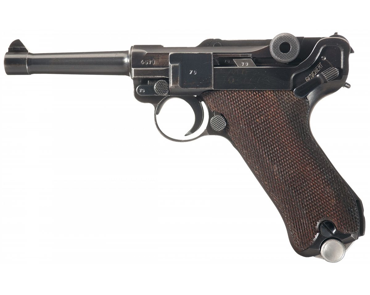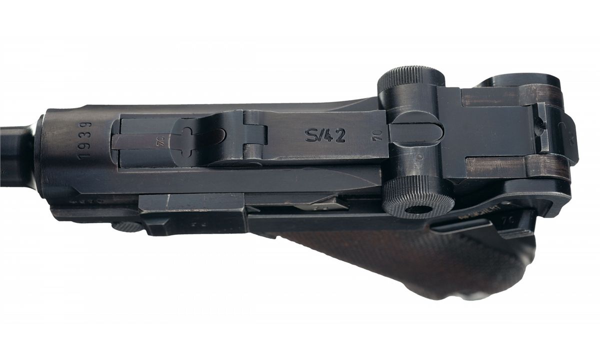 This is a solid example of a World War II Luger pistol, as manufactured by the Mauser factory. The chamber is dated 1939 and the front toggle has the wartime code of "S/42", for the Mauser factory. The right side barrel extension is stamped double "eagle/63" Waffenamt proof along with the single eagle firing proof. It is numbered in the military fashion with the full serial number (4570) on the major components, with the last two digits (70) stamped on the various small parts. It has one blue unmarked magazine with aluminum base that is stamped "4570/n/Eagle 63" with the spare magazine stamped "4570/u/+/Eagle 63". This pistol is complete with a black leather holster marked "GENSCHOW & COMPANY/1937" on the back.