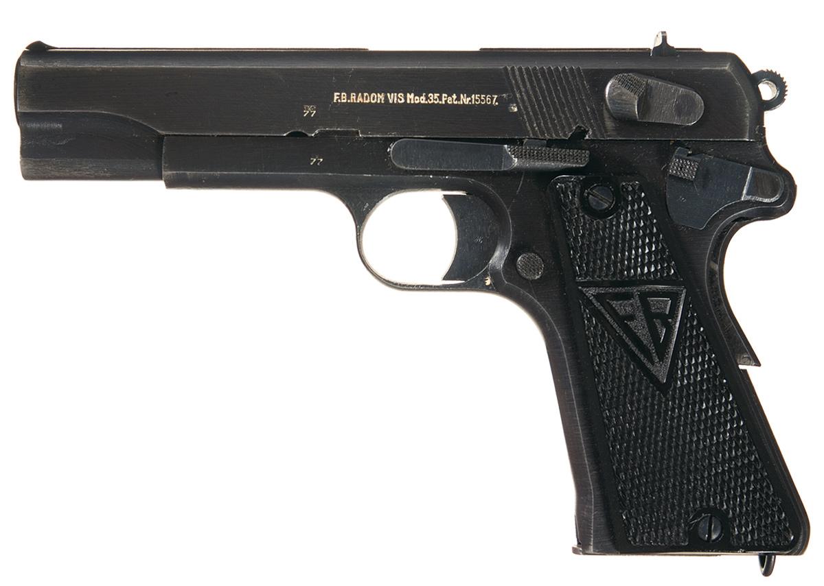 The left side of the slide is marked "F.B. RADOM VIS Mod. 35. Pat. Nr. 15567". The slide and frame are stamped with eagle/77, along with a single eagle/623 proof and eagle firing proof on the slide. Fitted with "FB" and "VIS" molded grips.