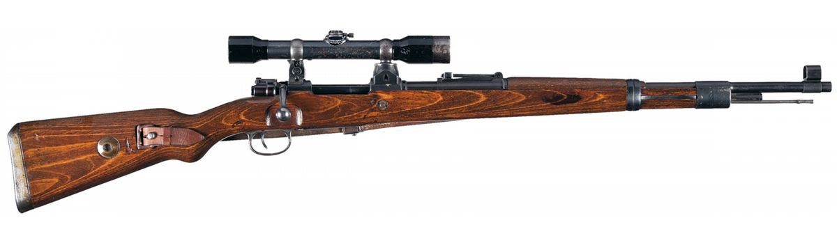 Condition: Very fine as restored with half of a partially touched up blue finish overall with even light wear overall. The stock and handguard are both very good overall with minor handling marks, scratches and light pressure dents and dings, which has been varnished, but not sanded. The middle and front bands are both replacements. The scope and rings have 85% of it's original blue finish, with the front and rear ocular piece being black painted, with clear optics and markings on the side. The bolt assembly has been numbered to match the rifle. Overall a nice example of a rare and desirable Nazi sniper rifle.