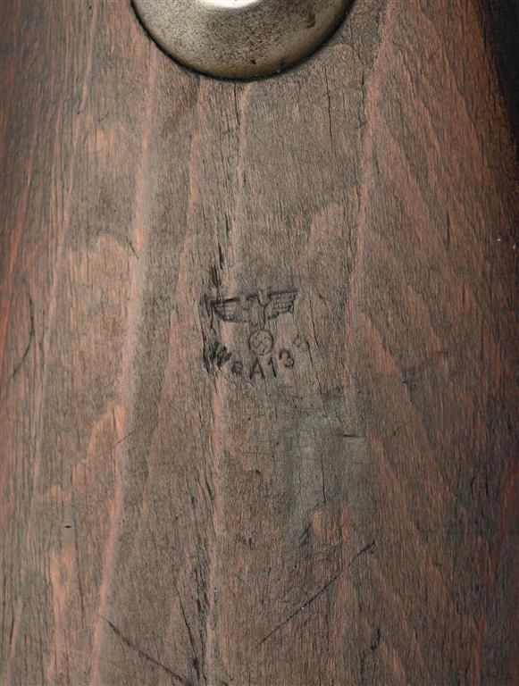 Blade and tangent sights, with "byf/42" on top of the receiver ring, "eagle/135" and "eagle/655" proofs. Smooth pistol grip stock with a brown leather sling and a "brg" marked buttplate. With a rubber muzzle cover and a "41asw" bayonet, 15 inches overall with a 9 7/8 inch blade, wood grips, and matching scabbard.
