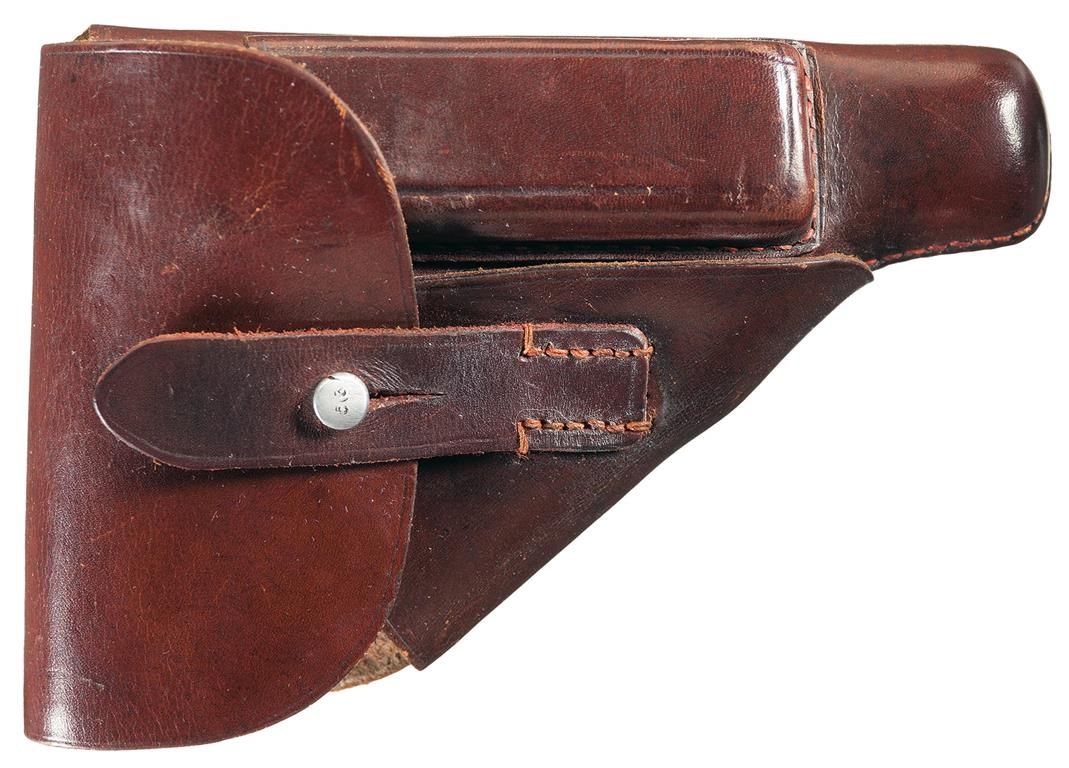 This is a WWII Walther manufactured PPK pistol with the "Eagle/C" Police proofs. It has standard fixed sights, standard Walther markings on the left side of the slide, and the "Eagle/C" police stamp on left side of frame behind the trigger. "Eagle/N" proofs on right side of slide, chamber and muzzle, and matching numbers inside the slide and on the frame. It is fitted with brown plastic checkered grips with Walther banners, complete with a brown commercial leather holster stamped. "D.R.G.M./Crossed Rifles" on the front flap with one spare Walther marked magazine.