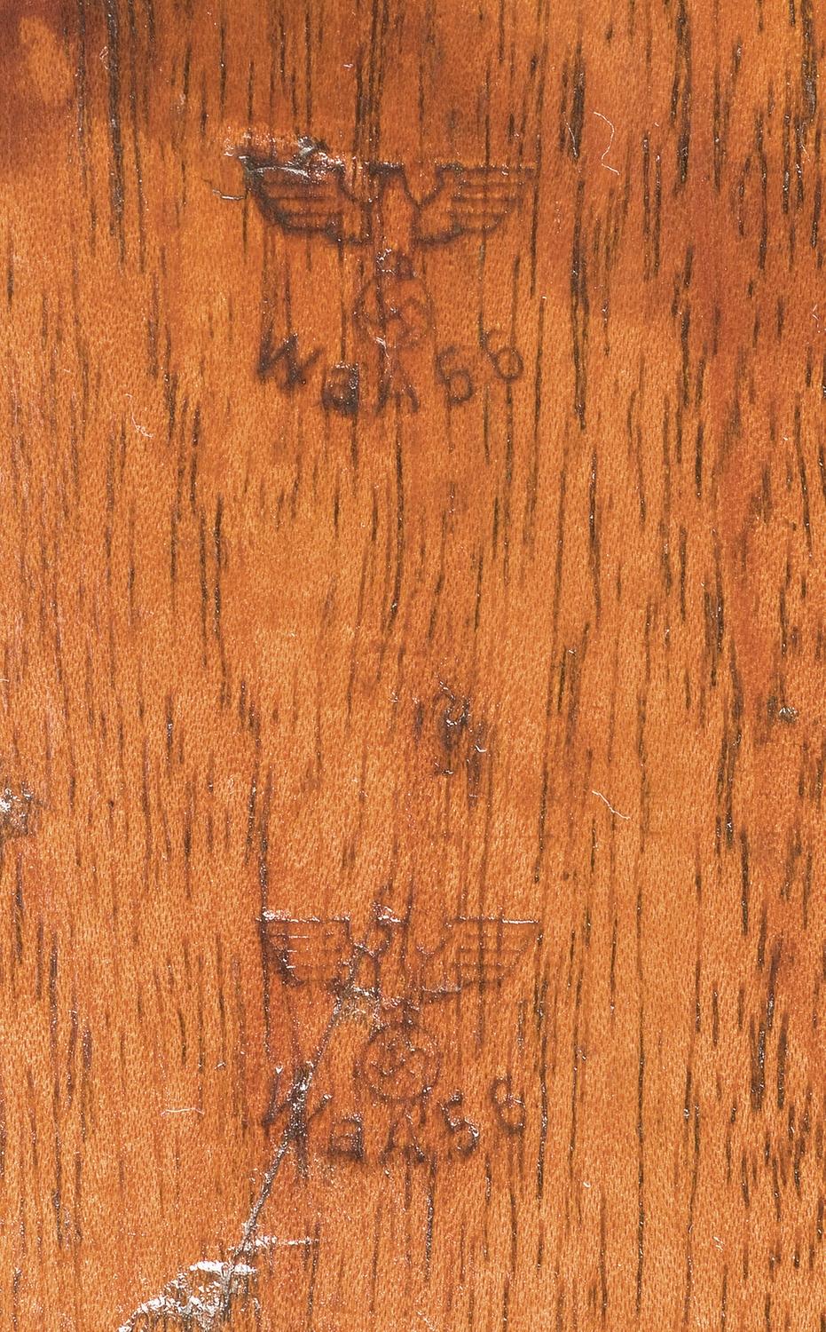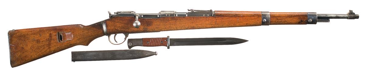 Made in Budapest for use by the Nazis as a substitute rifle. Blade and tangent sights, with "eagle/ 56" proofs on the barrel and receiver ring. Matching numbers. Smooth stock, with "56" stamps, matching number and a flat buttplate. With a "43asw" (Horster, Solingen) bayonet with 10" blade, ribbed plastic grips and metal sheath.