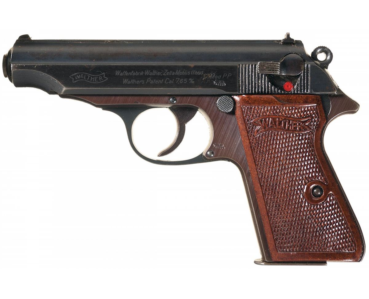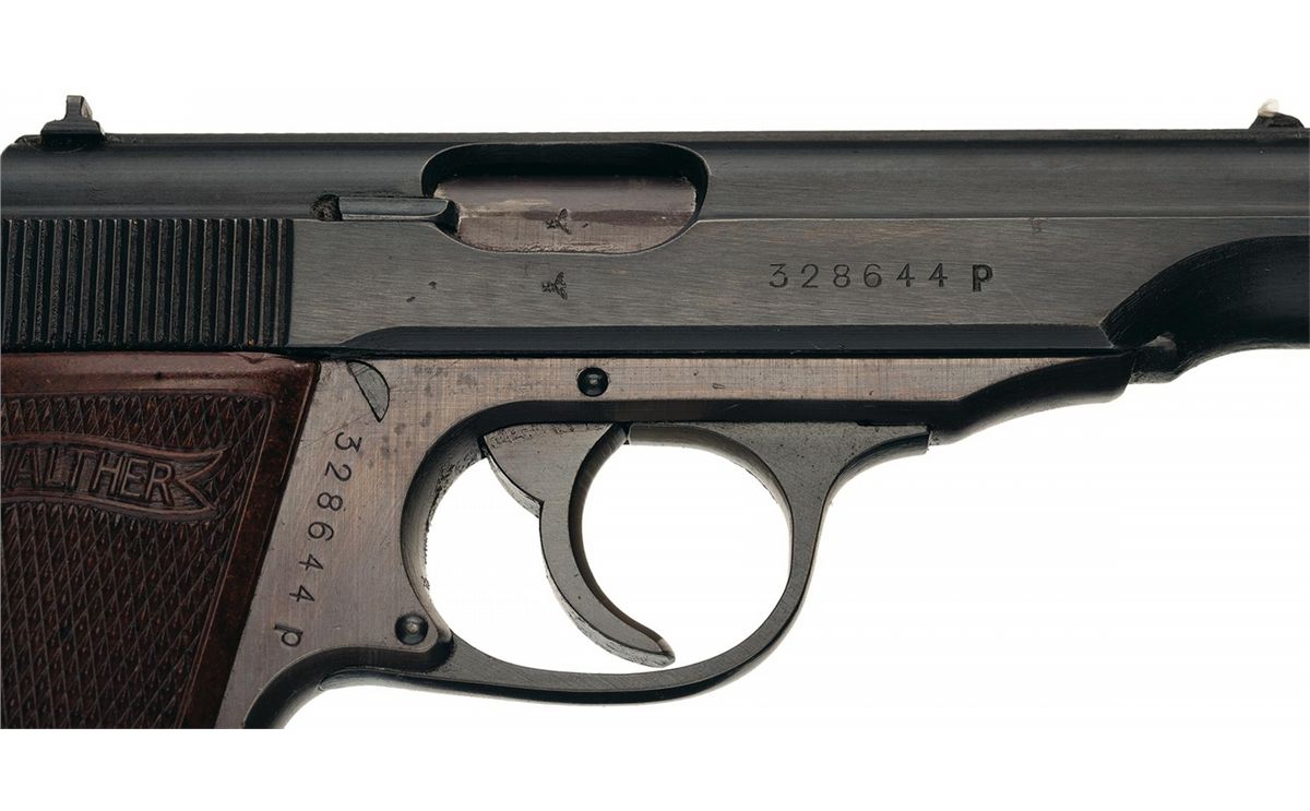 Fixed sights with "eagle/N" proofs on the chamber, muzzle and slide. "WaA359" Heer stamps on the left side of the slide and frame, and the Walther banner, 2-line address and caliber markings and "Mod. PP" on the left side of the slide. Matching numbers are present on the right side of the slide and frame. Fitted with a 60 degree safety, loaded chamber indicator, and checkered Walther banner grips.