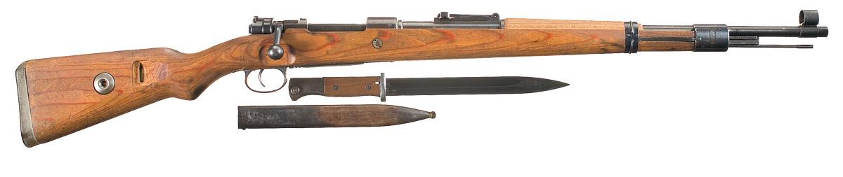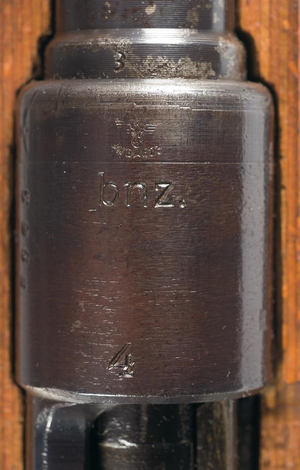 Manufactured by Steyr-Daimler. The top of the receiver ring is marked with an "eagle swastika / WaA623" proof over "bnz.", the wartime code for Steyr, over "4", with an eagle firing proof and serial number on the left side and an "eagle/WaA623" proof on the right side. The left rear of the barrel is marked with an "eagle/WaA623" proof and an eagle firing proof. The left side receiver wall is marked "Mod. 98". Hooded ramped blade front sight and adjustable rear tangent sight graduated to 200 meters. Mounted with a one piece pistol grip stock, absent of any markings. Complete with the cleaning rod and "jwh / 44" coded bayonet and metal scabbard (matching 6300t).