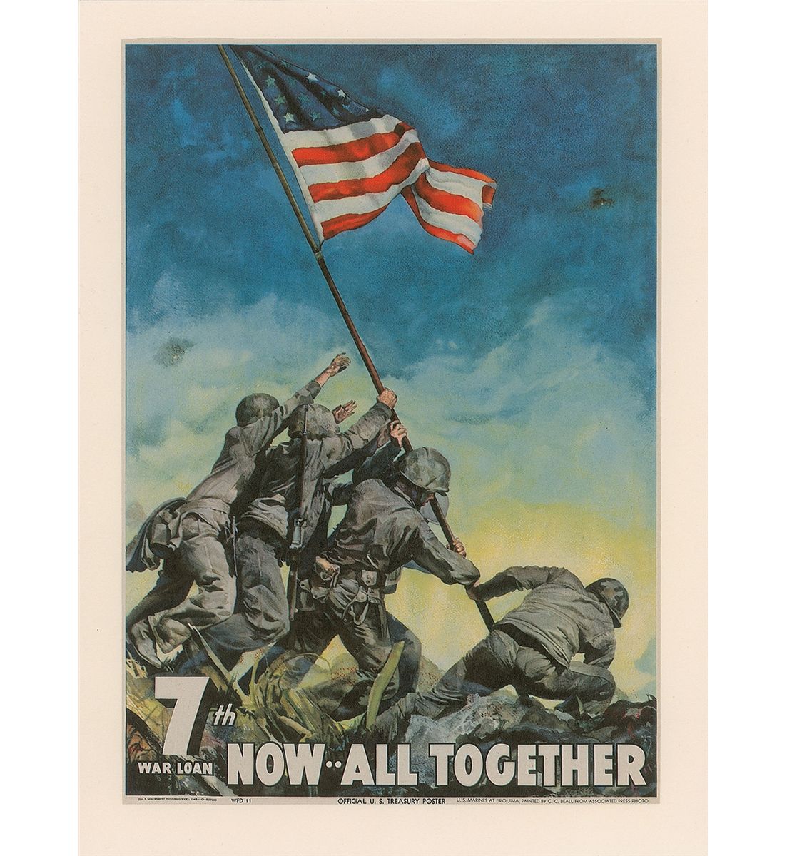 Iconic original color 9 x 12.5 World War II poster distributed by the US Treasury in 1945, showing the classic image of the Iwo Jima flag raising, with “7th War Loan Now…All Together,” in white text below the image. Printed at the bottom is “U.S. Government Printing Office: 1945—O-637980.” Affixed to an off-white 10.5 x 14 heavyweight sheet. In fine condition, with a smoothed and unobtrusive central horizontal fold. A beautiful, vibrant example of one of the most recognizable images in American history.
