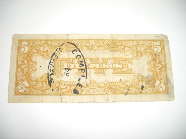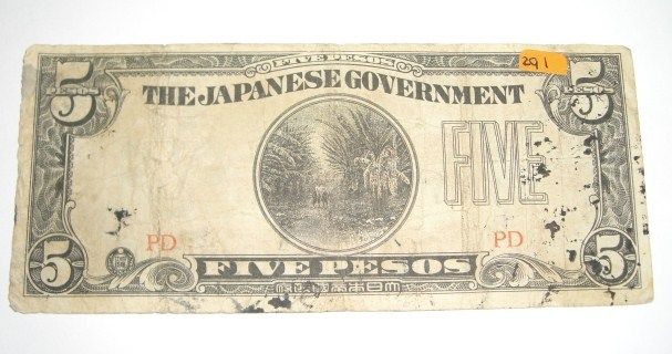 World War II Occupied Japanese 5 Pesos Bill *PLEASE LOOK AT PICTURE TO DETERMINE GRADE - NICE NOTE*!! ***Coin, Currency & All Items Listed in this auction - Grades, Conditions and Values are not Safe Deposit Coins LLC Responsibilty. Grades, Condition and Values are determined by Consigner(s) & Buyers ONLY***