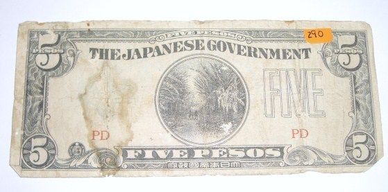 World War II Occupied Japanese 5 Pesos Bill *PLEASE LOOK AT PICTURE TO DETERMINE GRADE - NICE NOTE*!! ***Coin, Currency & All Items Listed in this auction - Grades, Conditions and Values are not Safe Deposit Coins LLC Responsibilty. Grades, Condition and Values are determined by Consigner(s) & Buyers ONLY***