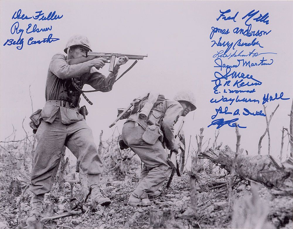 Satin-finish 14 x 11 photo of combat in the Pacific, signed in blue felt tip by 14 veterans who served with either E. B. Sledge K/3/5, Robert Leckie H/2/1, or John Basilone on Guadalcanal/ Iwo Jima who were the inspiration for HBOs The Pacific miniseries. Signers are: James Anderson (Peleliu, Okinawa), Dick Kerin (Iwo Jima), Charles Red Womack (Cape Gloucester, Peleliu, and Okinawa), James Martin (Iwo Jima), C. A. Rea (Iwo Jima), Fred Miller (Cape Gloucester, Peleliu), Harry Bender (Okinawa), John Dillon (Okinawa), W. J. Hall (Peleliu, Okinawa), Sterling Mace (Peleliu, Okinawa), Leo Schmittgens (Okinawa), Billy Joe Cowthron (Iwo Jima), Des Fullmer (Iwo Jima), and Roy Elner (Iwo Jima). In very fine condition. Accompanied by four photos taken at time of signing.