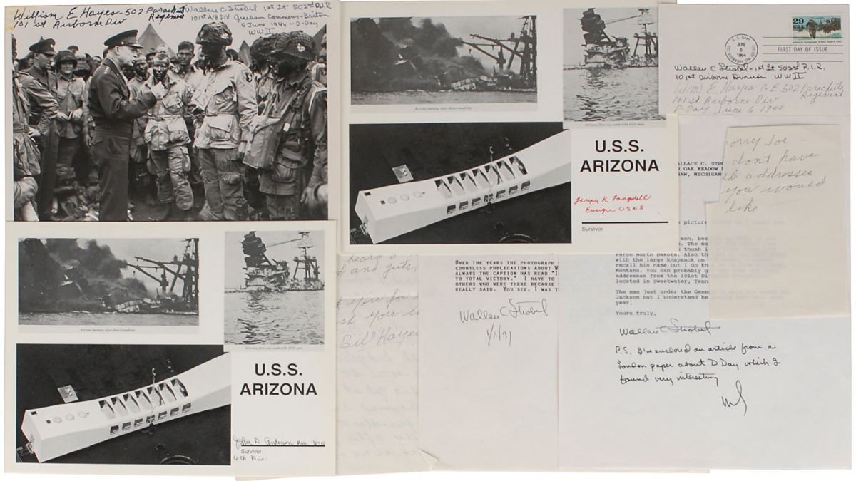 Collection of eight items signed by military figures related to Pearl Harbor or D-Day, including: John D. Anderson (SP); Joseph K. Langdell (SP); William E. Hayes and Wallace C. Strobel (SP and FDC); Wallace C. Strobel (TLS and souvenir typescript); and William E. Hayes (ALS and partial handwritten note). In overall fine condition.