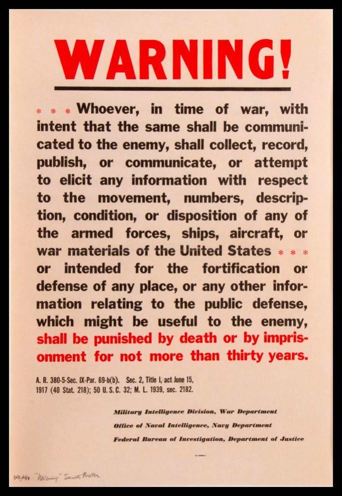 Vintage World War II Poster. Warning! [Espionage punishable by death], Anon. Paper size: 23 x 17 inches. Linen backed. Condition: as per photograph.