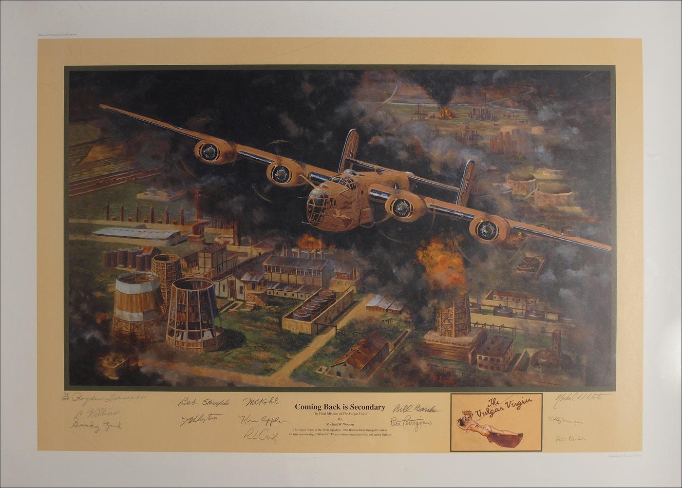 Limited edition 33.75 x 24.5 lithograph entitled ‘Coming Back is Secondary,’ numbered #34/100, signed in pencil by 12 former pilots and crewmen who were veterans of the attacks made against German-held oil refineries at Ploesti. Signers are: Jackson B. Clayton, Royden Lebrecht, Clint Killian, Grover Zink, Bill Banks, Pete Pettigrew, Leroy Morgan, Bob Sternfels, Bob Barker, Milton Kohl, Richard Critz, and Kenneth Apple. Also signed by the artist, Michael W. Wooten. Rolled and in fine condition. Accompanied by a booklet containing biographical information on each signer, a certificate of authenticity from the artist, and a printed description of the missions.